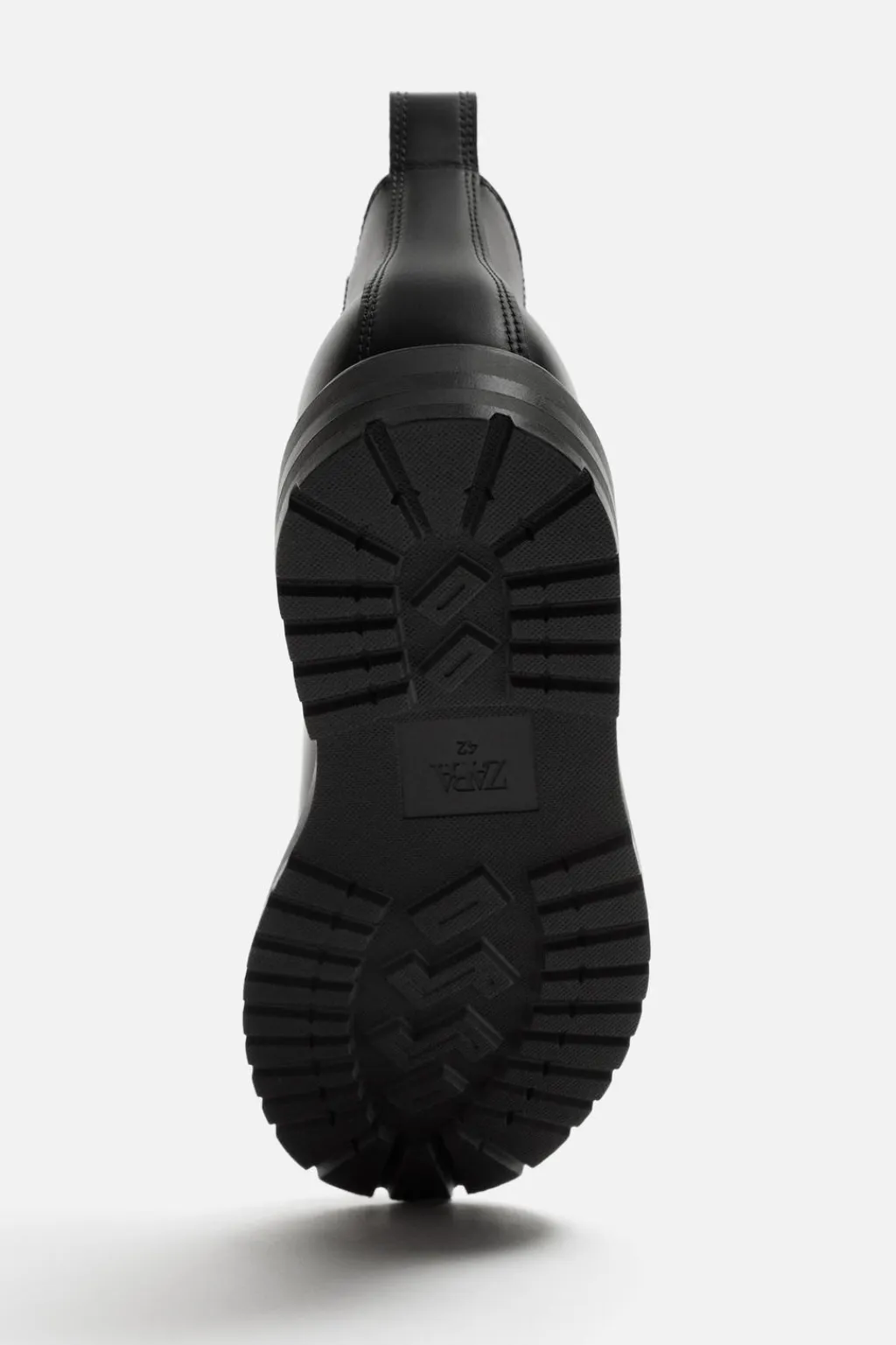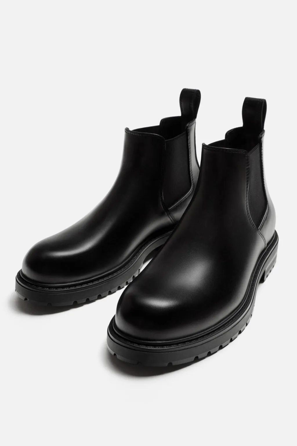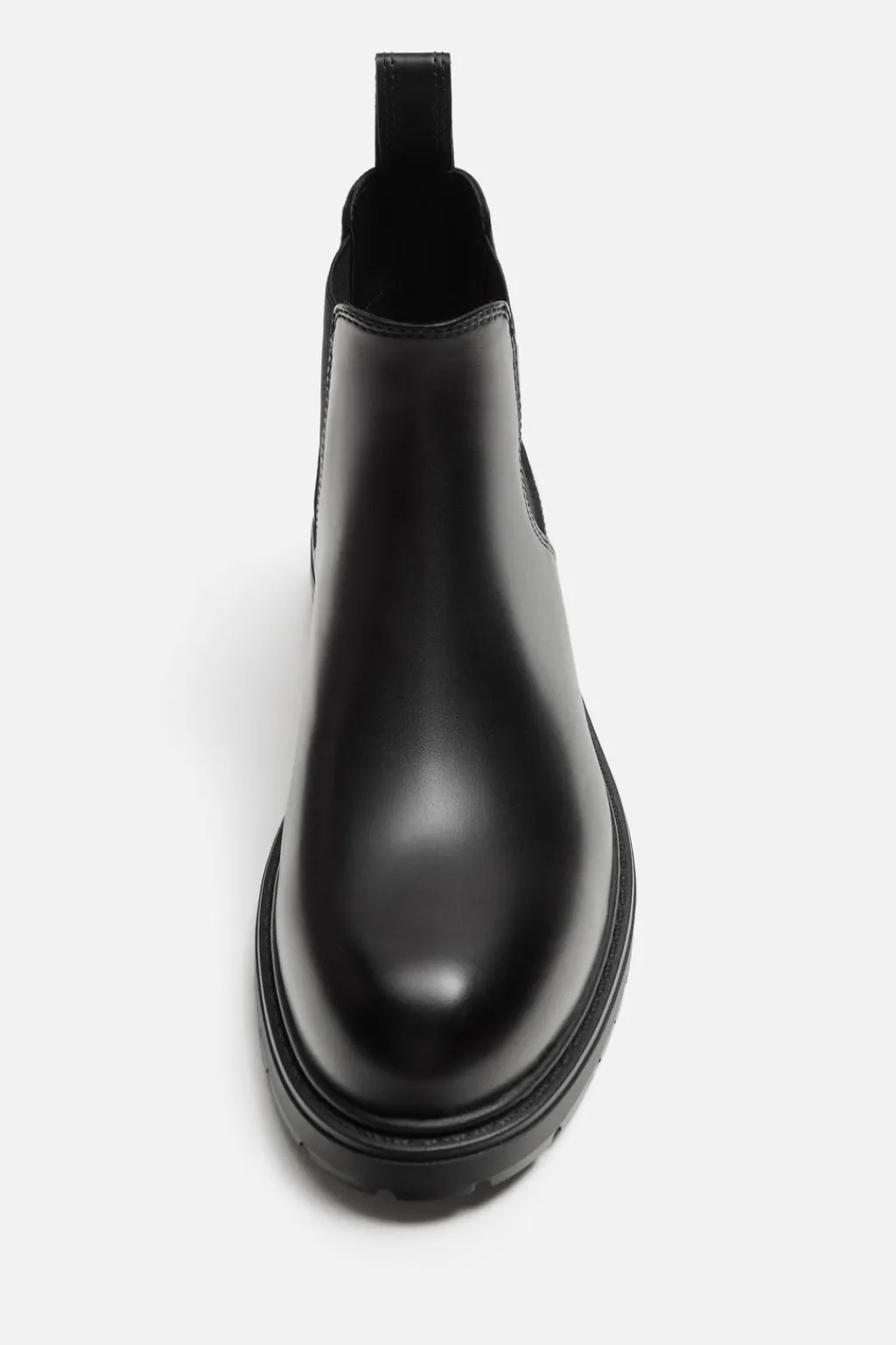 Bota tipo chelsea. Parte superior lisa. Cuenta con dos piezas elásticas laterales y tirador trasero para facilitar el calce. Horma redonda. Suela con volumen y piso track.