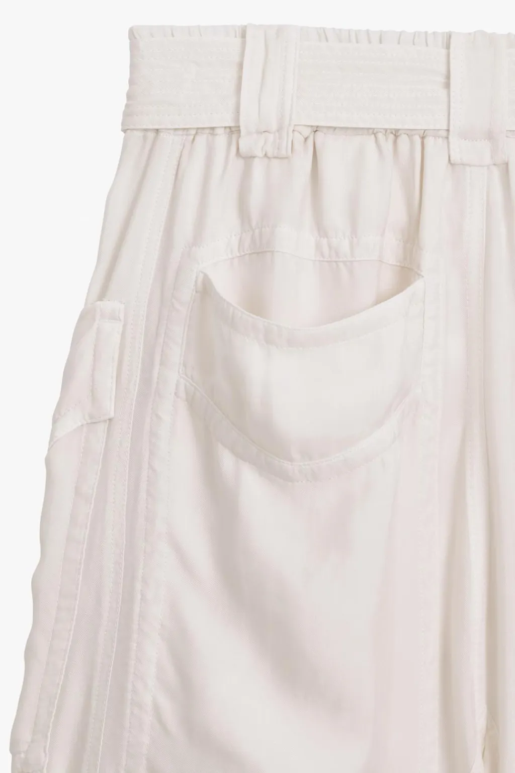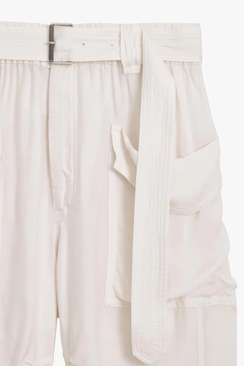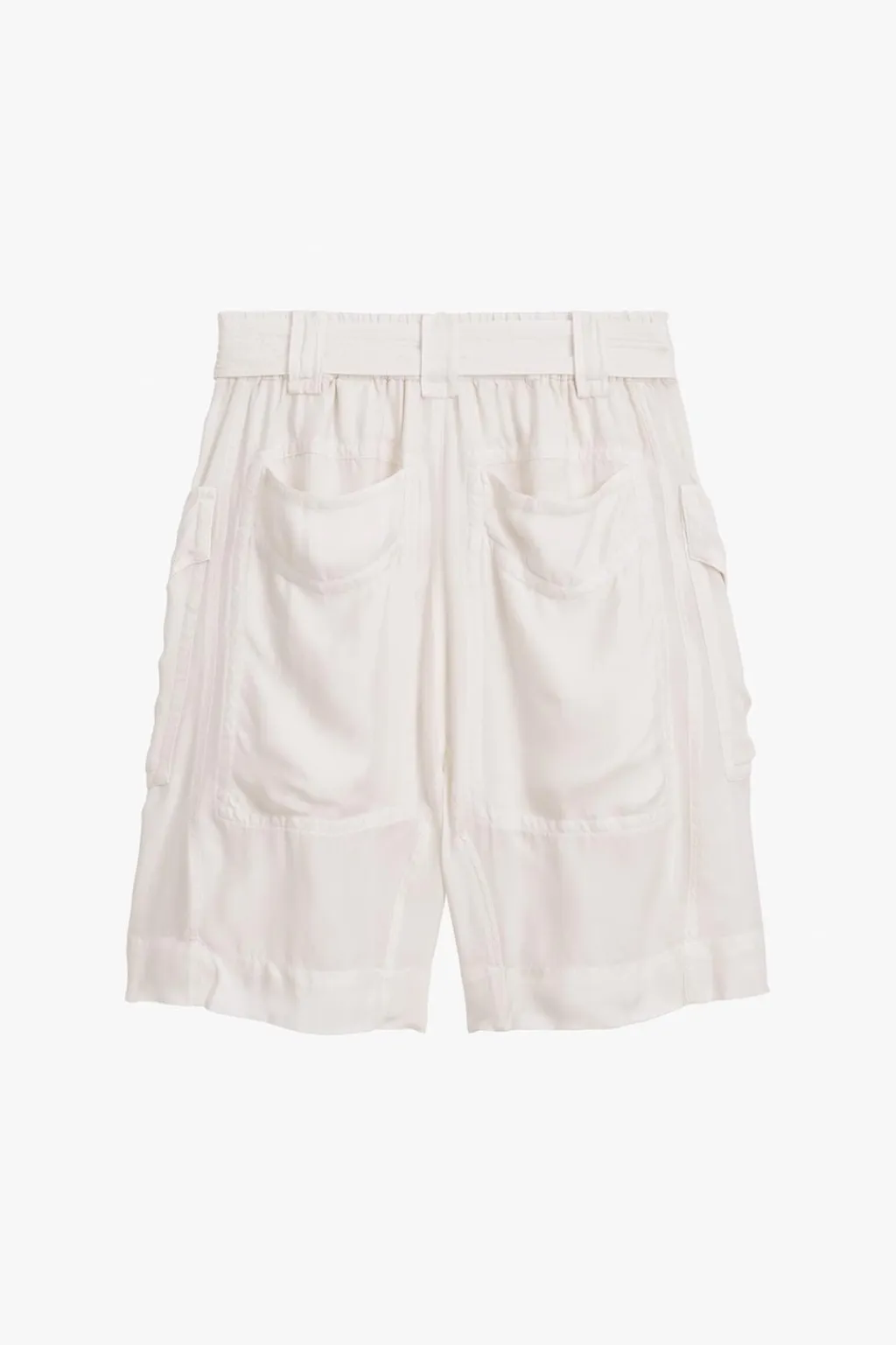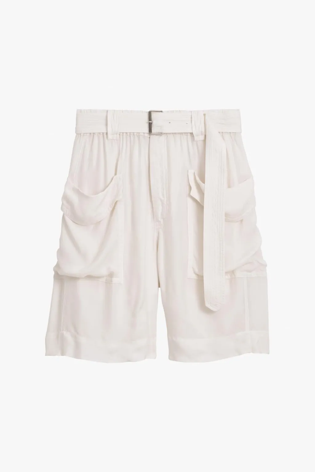 Bermuda fluida confeccionada en hilatura de cupro 100%. Tiro medio y cintura con elástico. Bolsillos de plastrón con solapa en delantero y de vivo en espalda. Cinturón en mismo tejido ajustable con hebilla metálica. Detalle de pespuntes a tono. Cierre frontal con cremallera y botones.