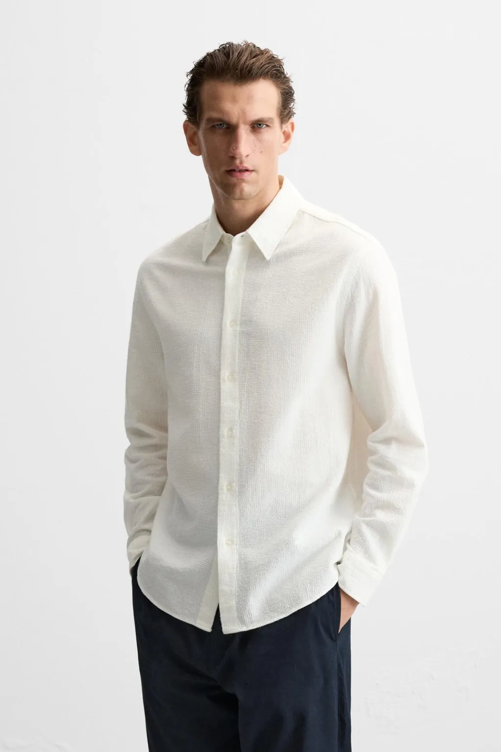 Camisa relaxed fit confeccionada en tejido con mezcla de algodón y lino. Cuello solapa y manga larga acabada en puño con botón. Cierre frontal de botonadura.