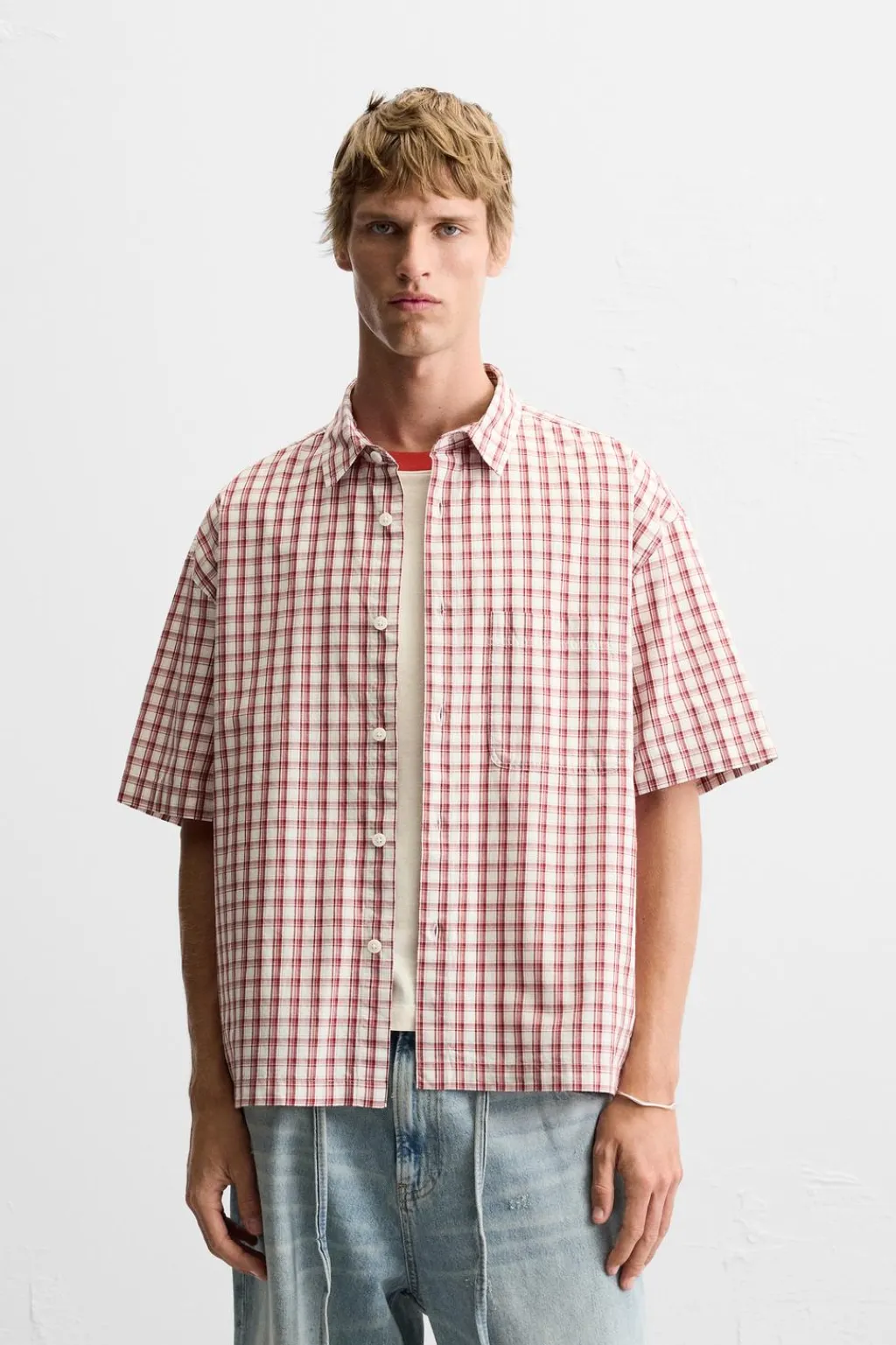 Camisa boxy fit confeccionada en tejido de algodón. Cuello solapa y manga corta. Cierre frontal de botonadura.