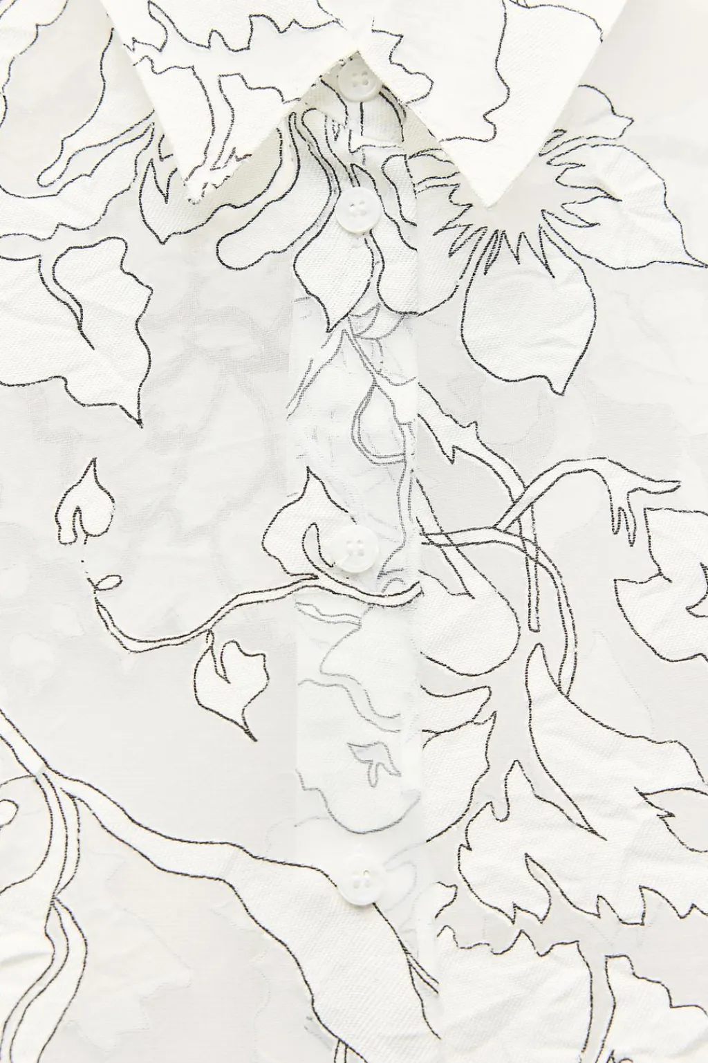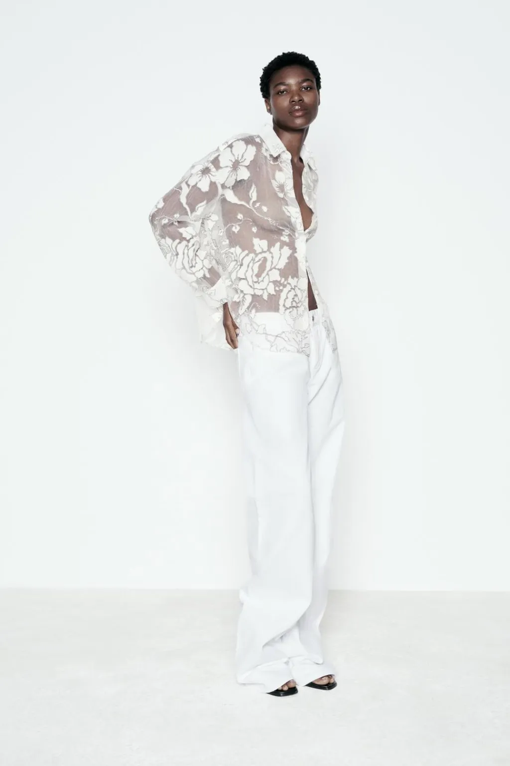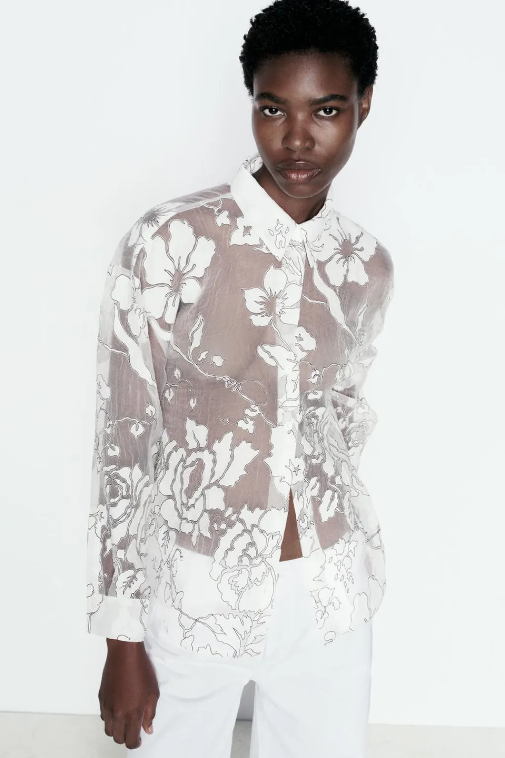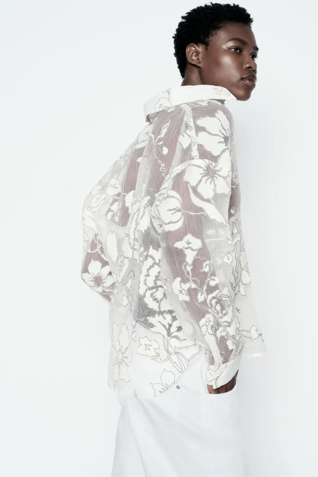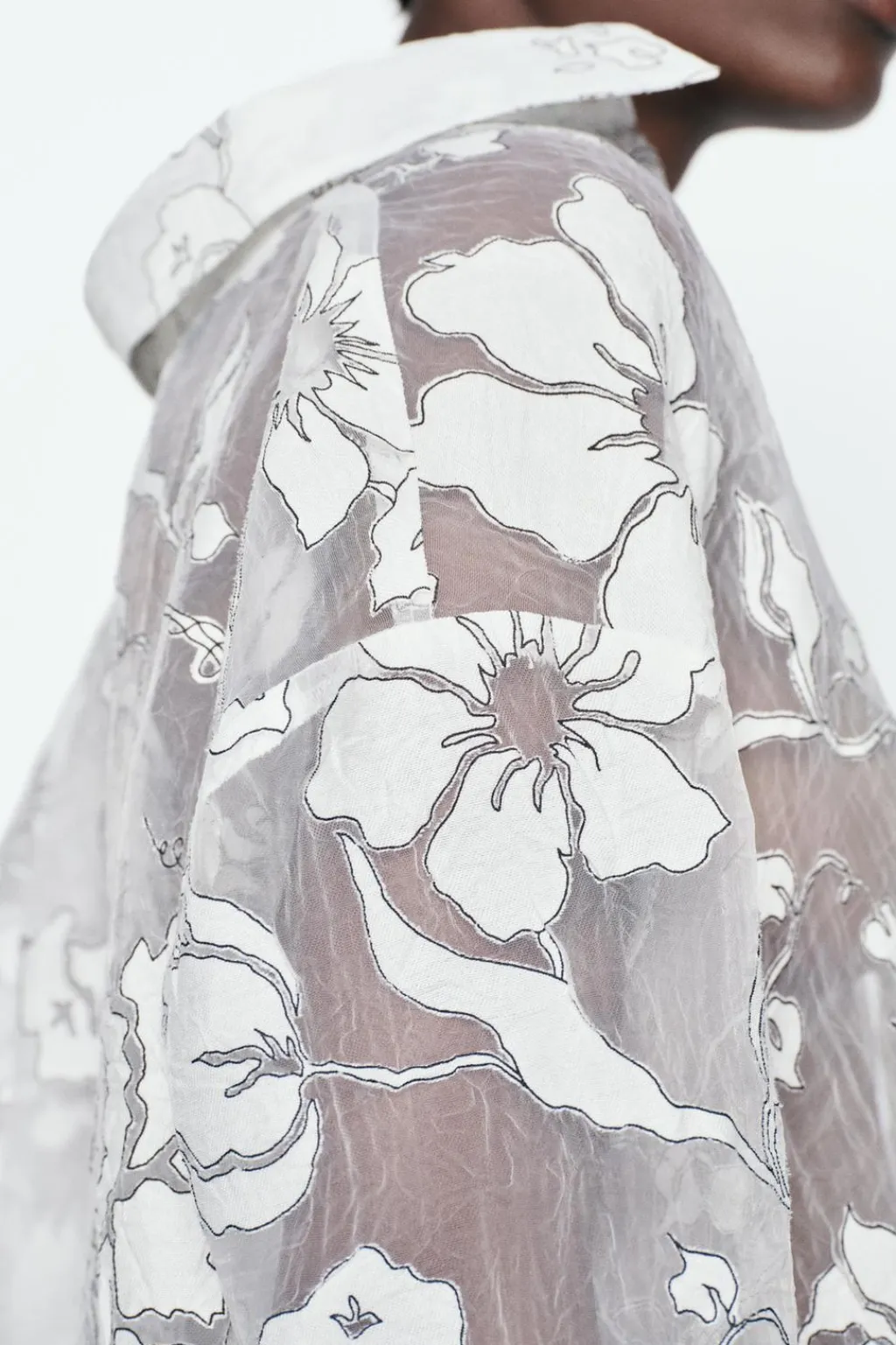 Camisa con tejido semitransparente combinado en devoré. Cuello solapa y manga larga. Cierre frontal con botones.
