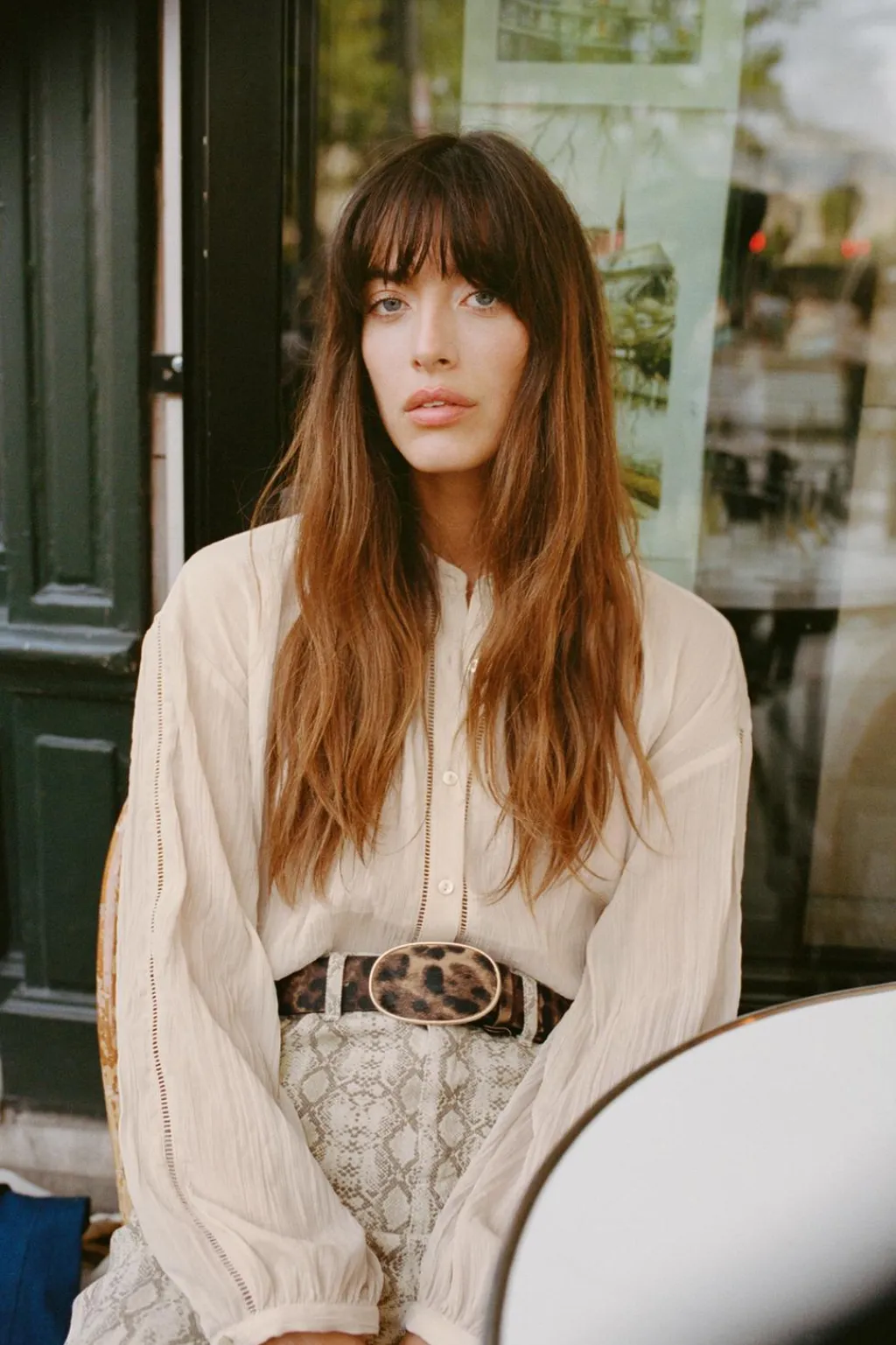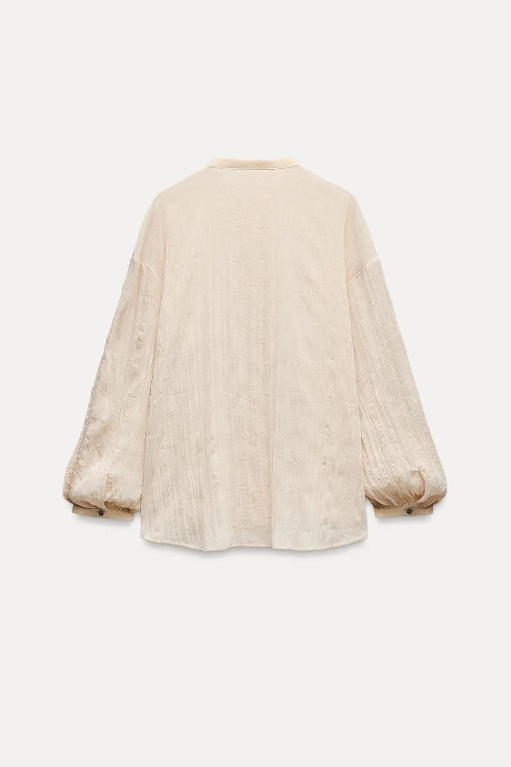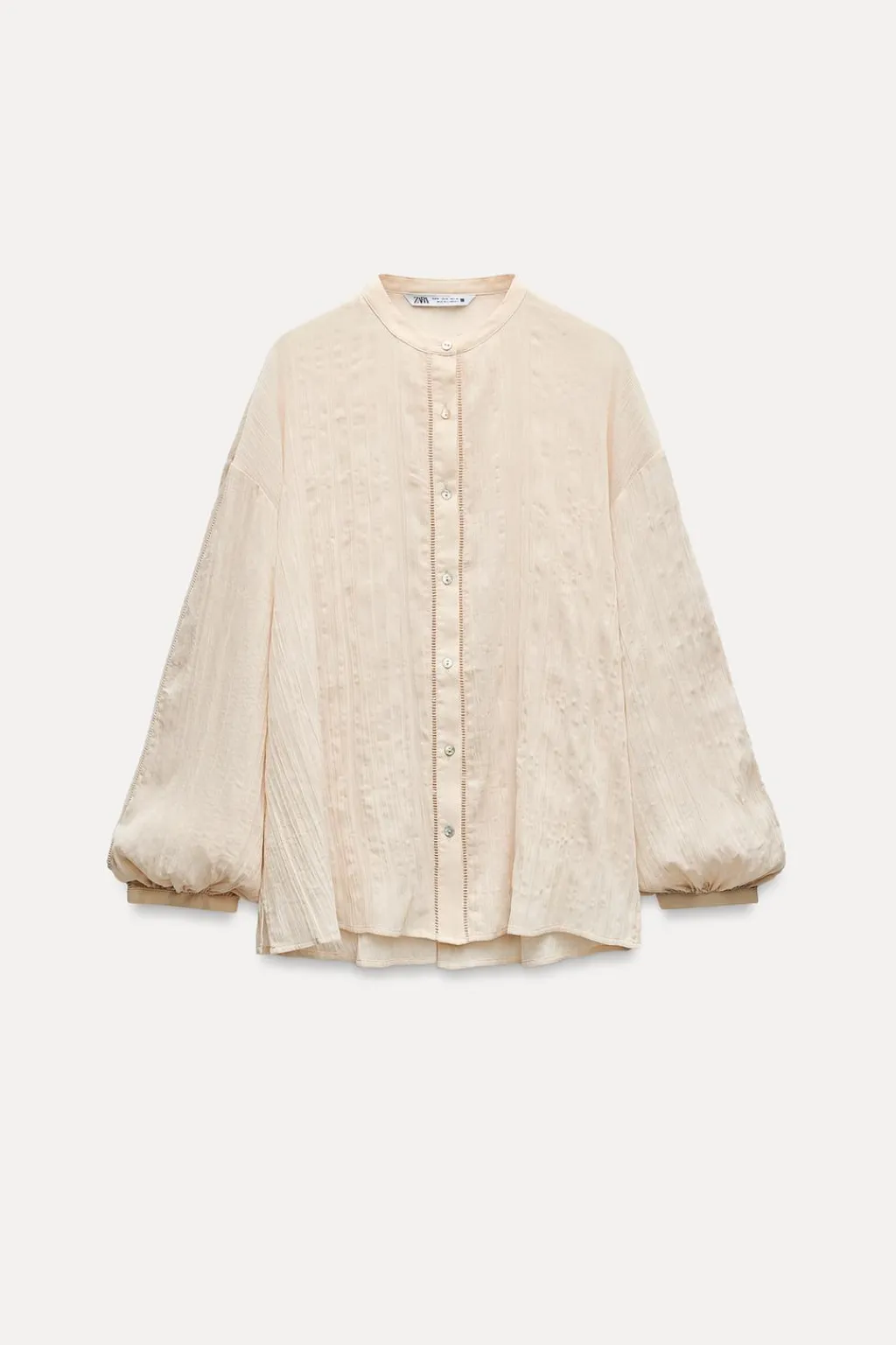 Camisa de cuello redondo y manga larga. Detalle de tejido efecto arrugado y entredoses delanteros. Bajo con aberturas laterales. Cierre frontal con botones.