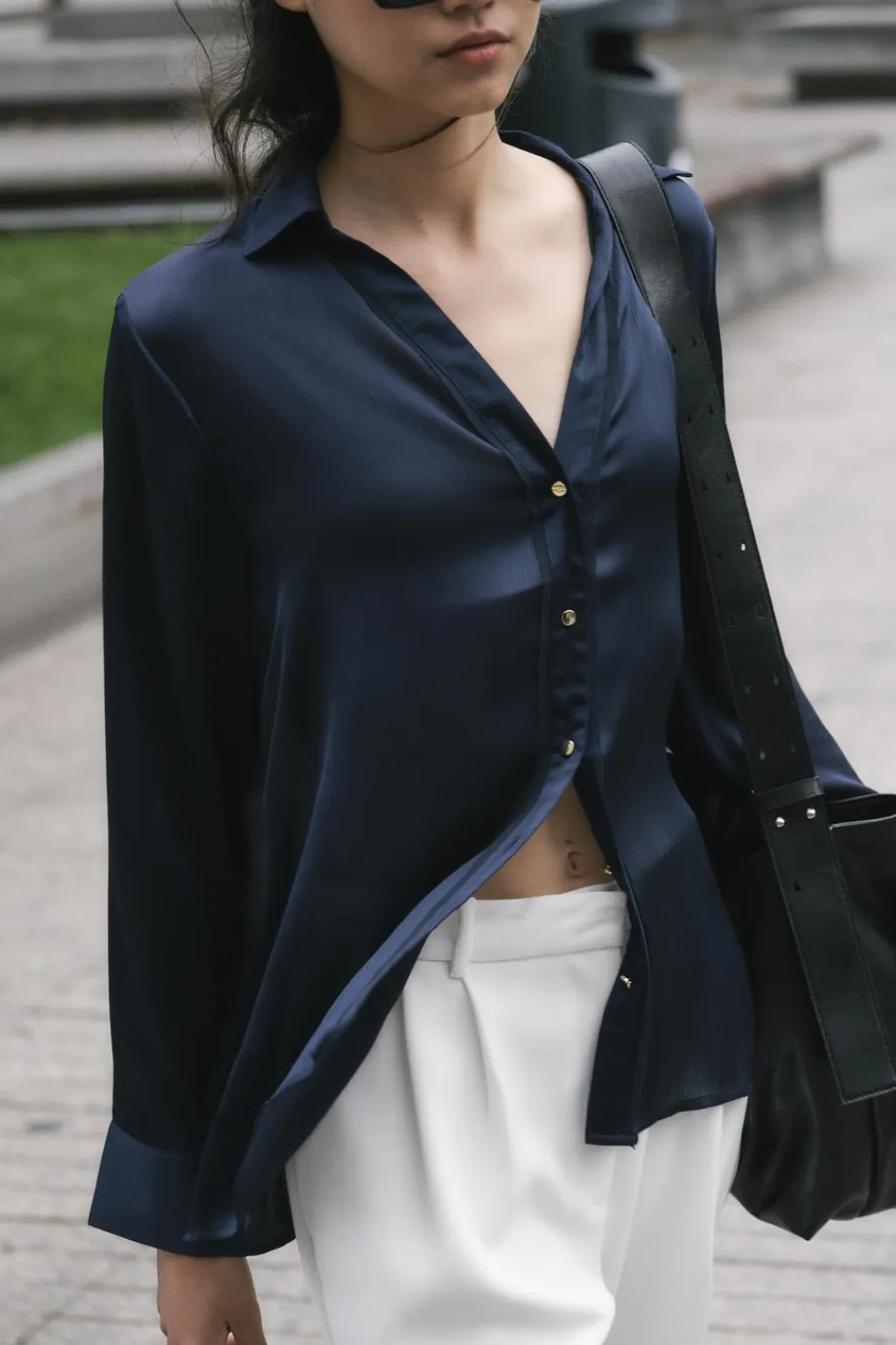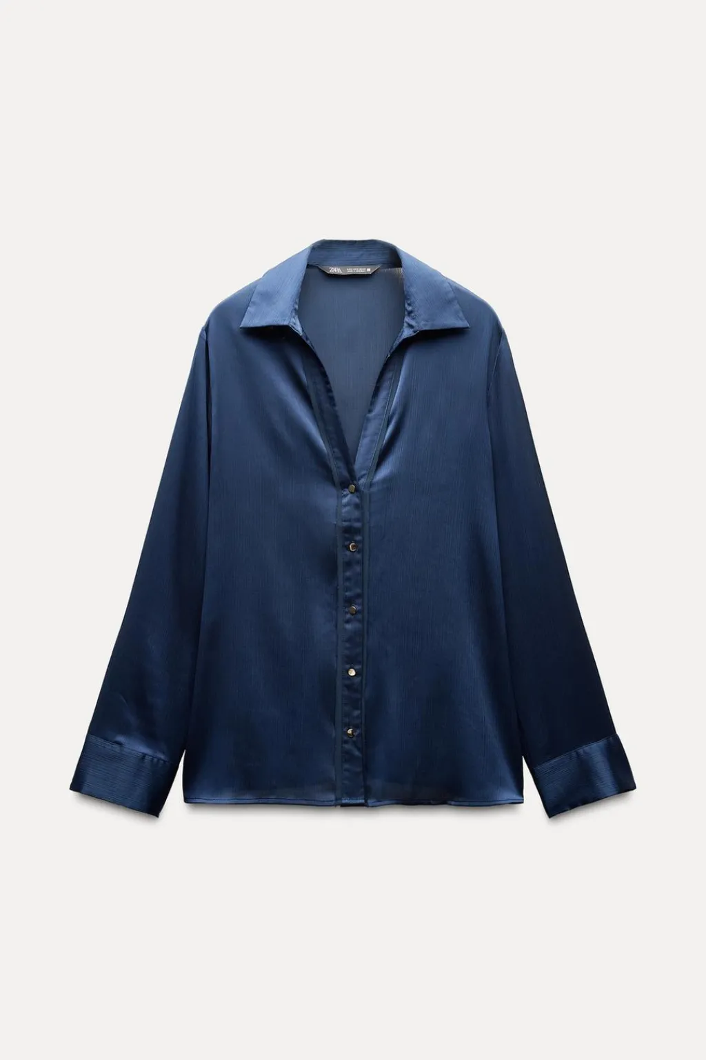 Camisa de cuello solapa con escote pico y manga larga. Detalle de tejido efecto arrugado. Cierre frontal con botones dorados.