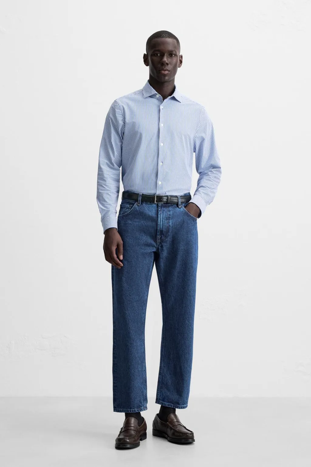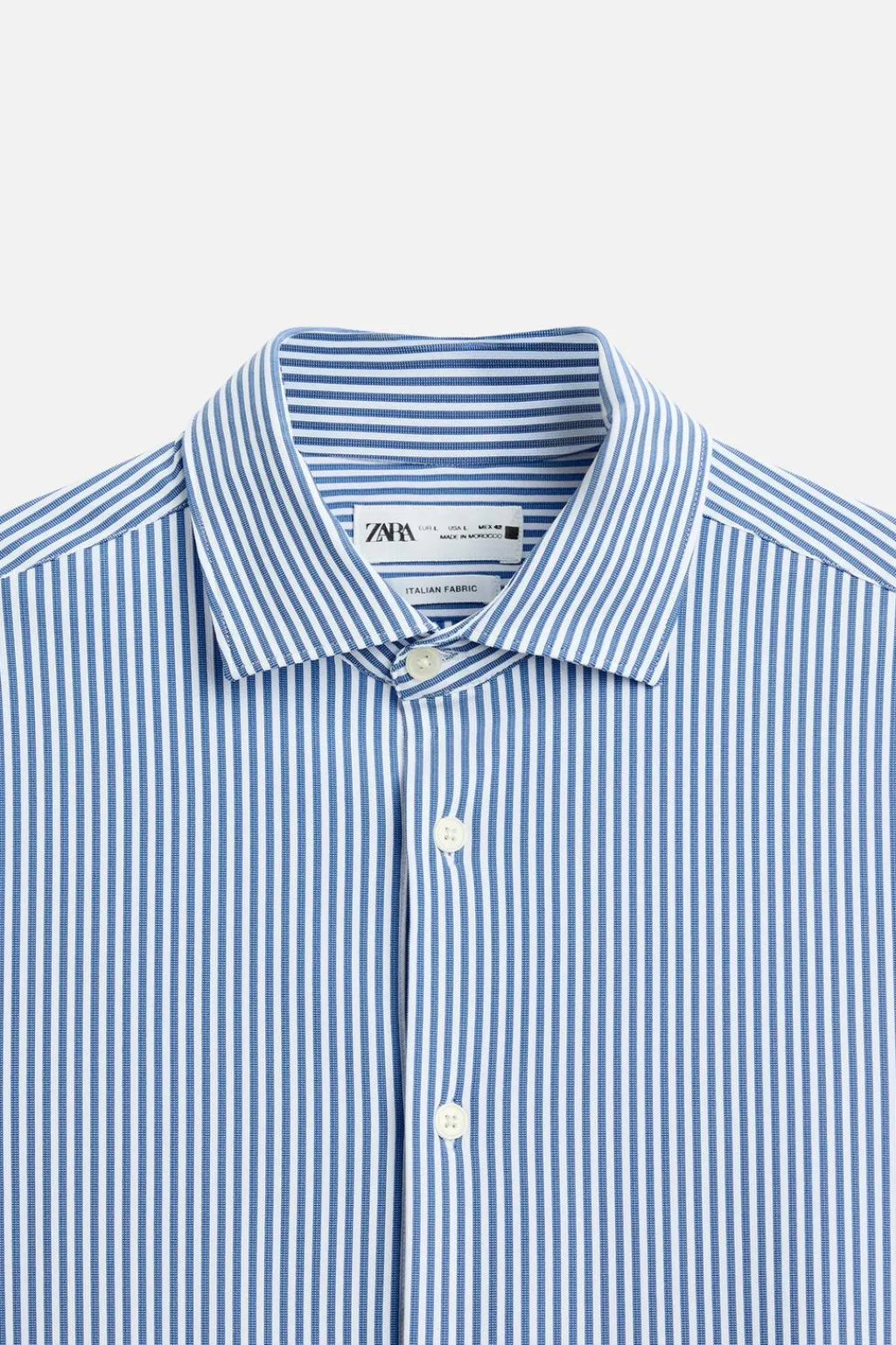 Camisa slim fit confeccionada en un tejido que minimiza la necesidad de plancha después del lavado. Cuello italiano y manga larga acabada en puño con botón. Cierre frontal de botonadura.