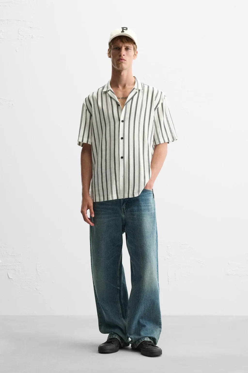 Camisa relaxed fit confeccionada en tejido con viscosa. Cuello bowling y manga corta. Cierre frontal de botonadura.