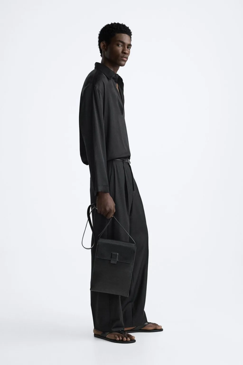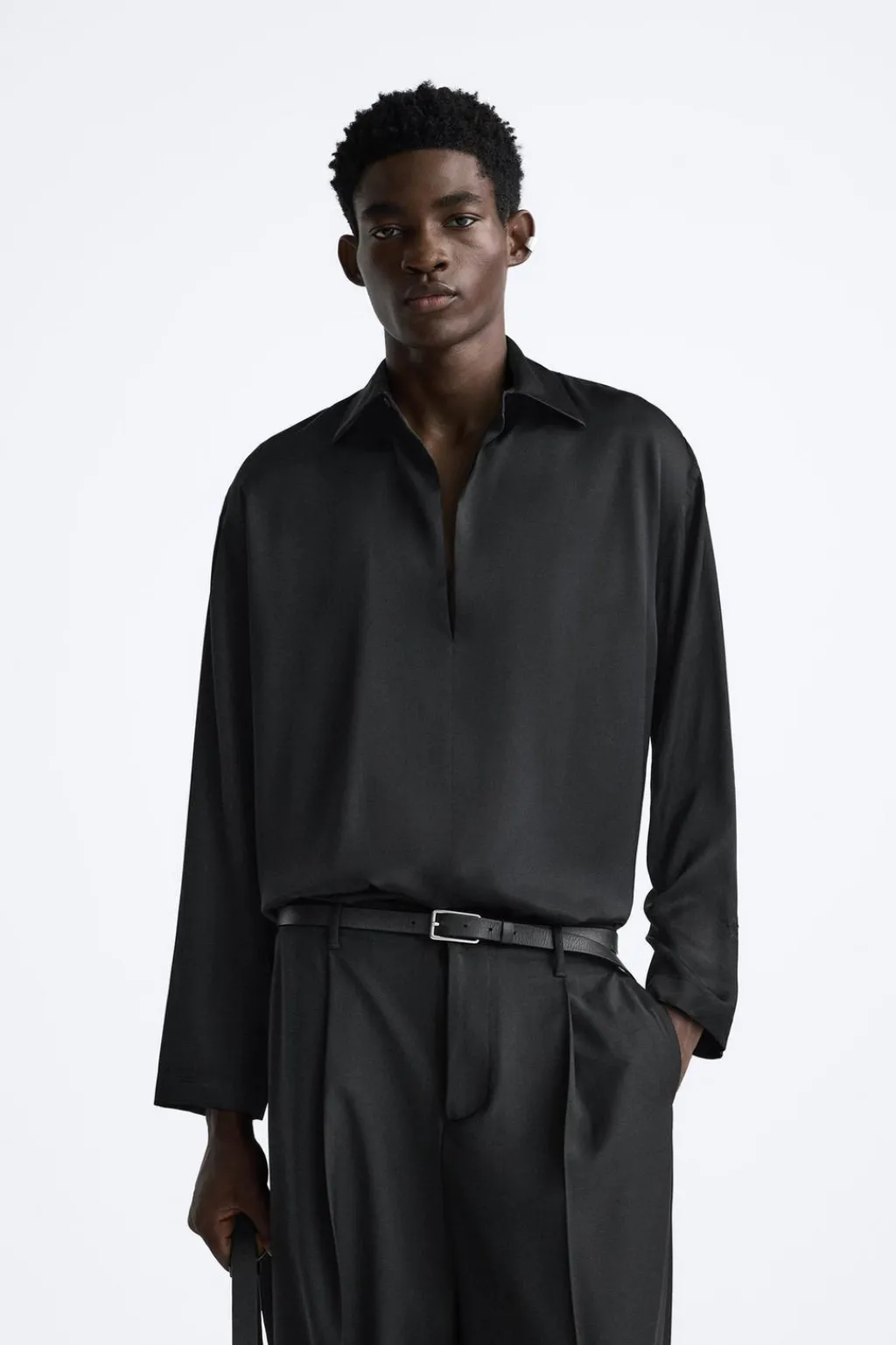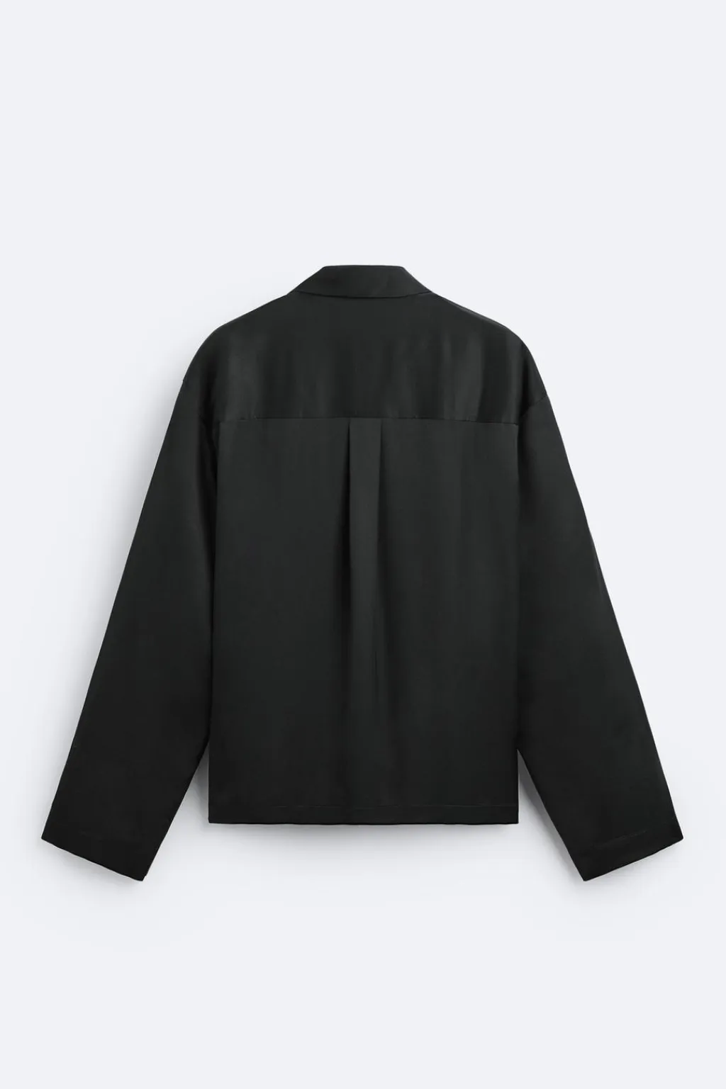 Camisa relaxed fit confeccionada en tejido de viscosa satinada. Cuello solapa con abertura frontal y cierre de botoón. Manga larga.