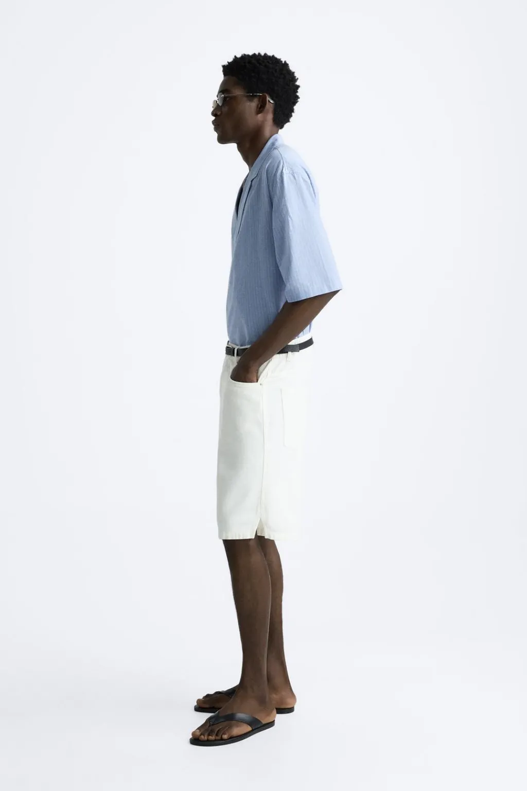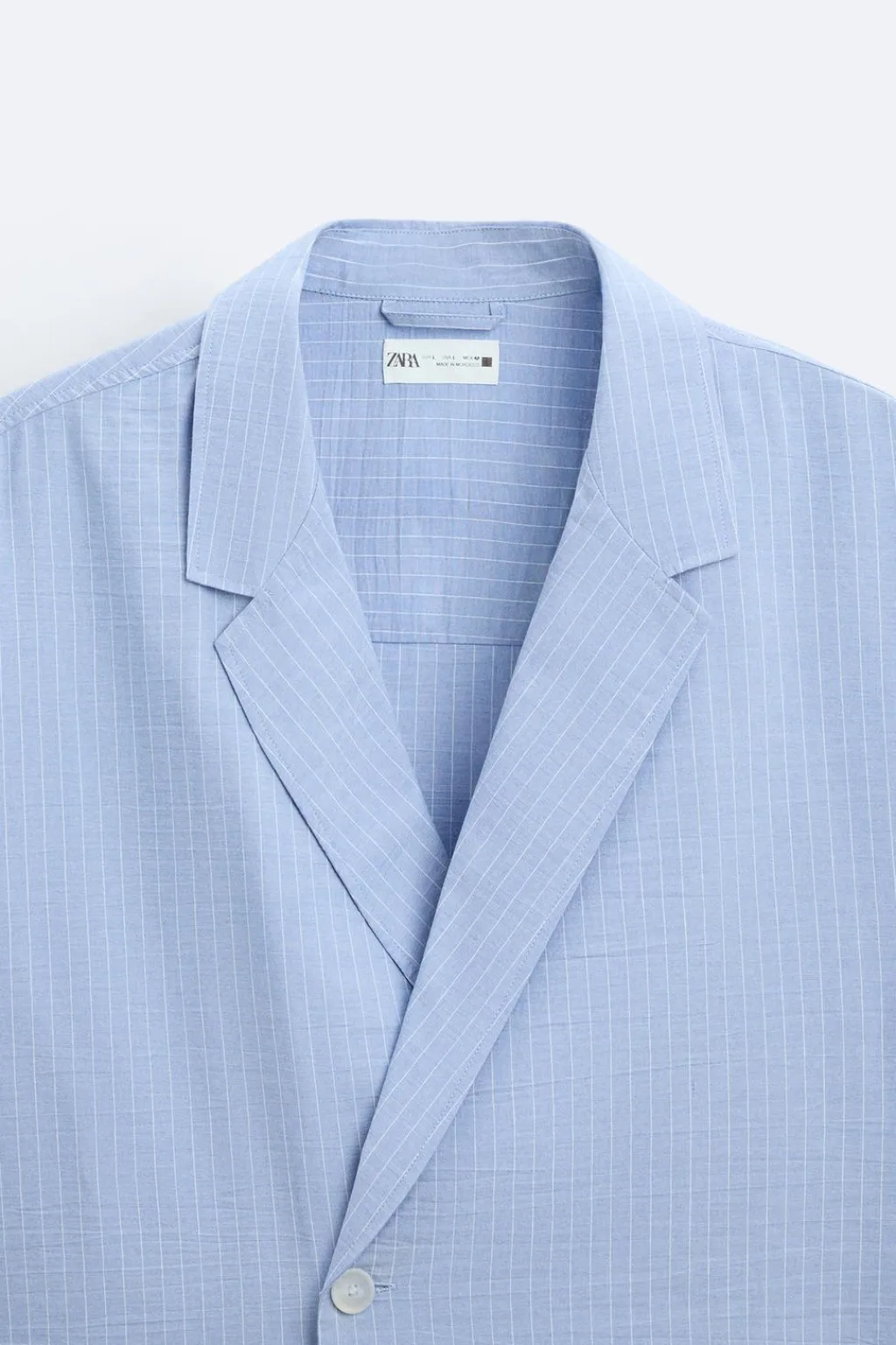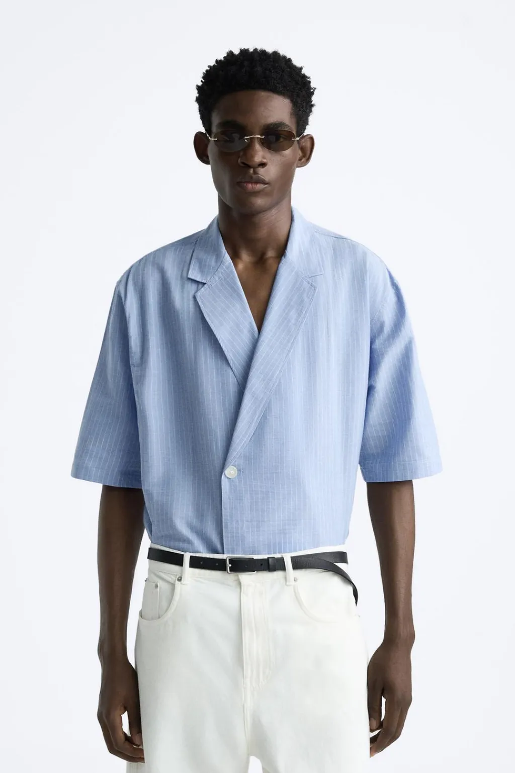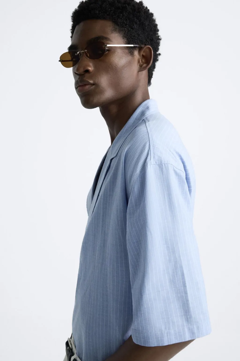 Camisa relaxed fit confeccionada en tejido con viscosa. Cuello son solapas de muesca y manga corta. Bajo con aberturas laterales. Cierre frontal de botonadura cruzada.