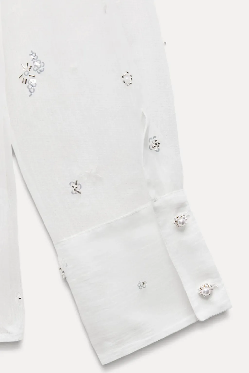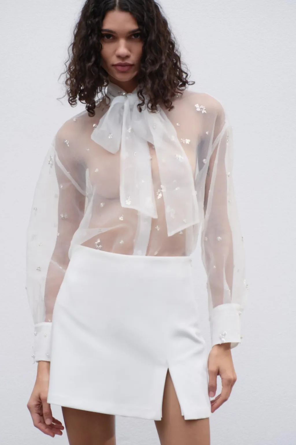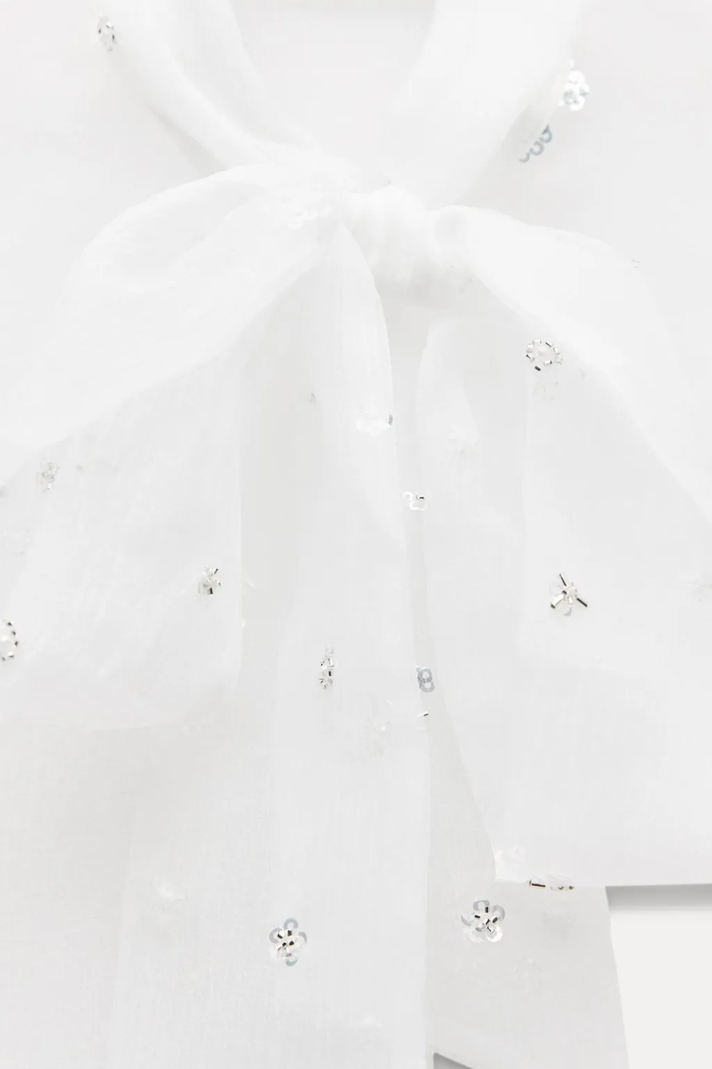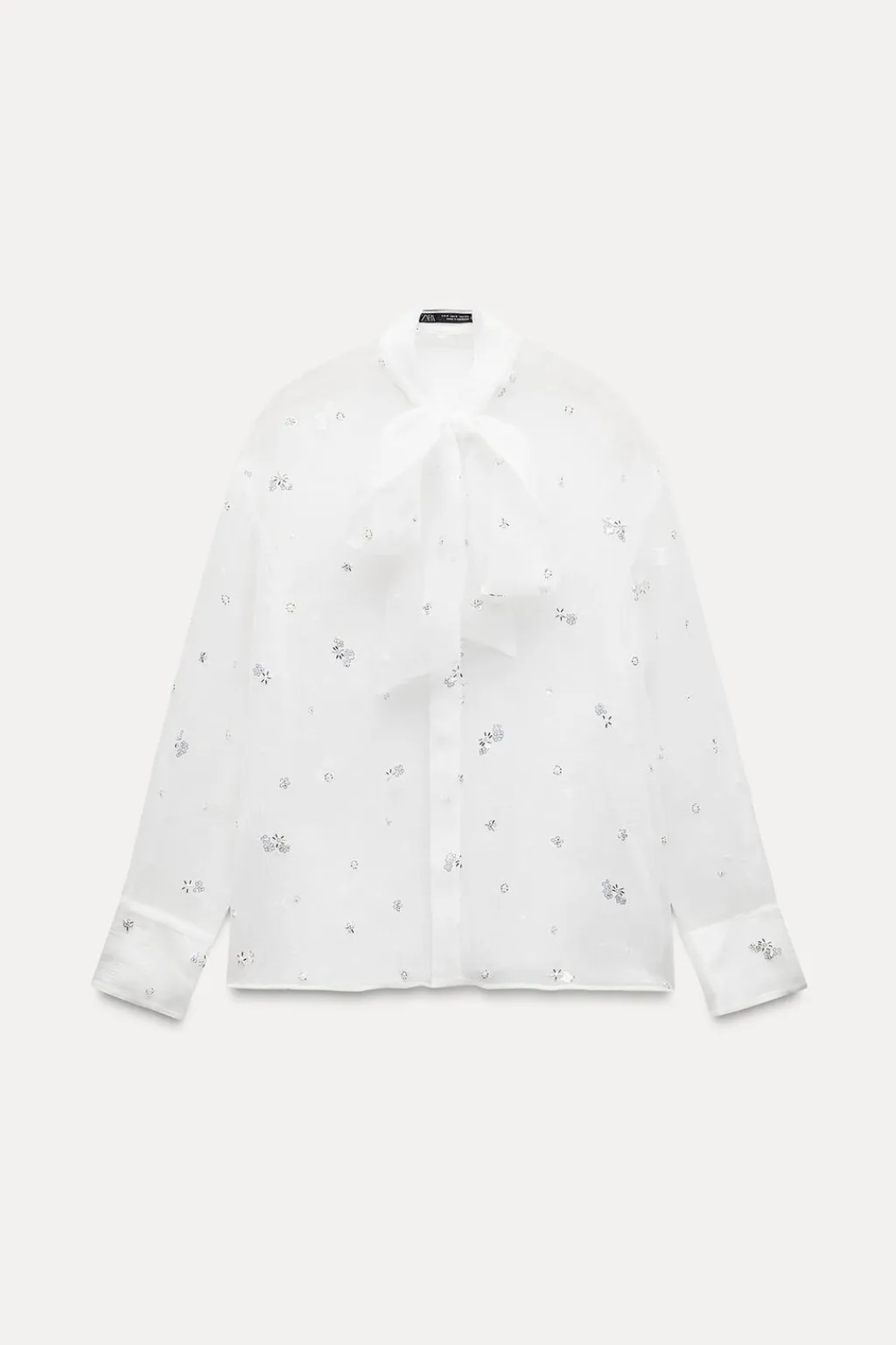 Camisa de cuello subido con lazo y manga larga. Detalle aplicación de lentejuelas y abalorios. Cierre frontal con botones ocultos por solapa.