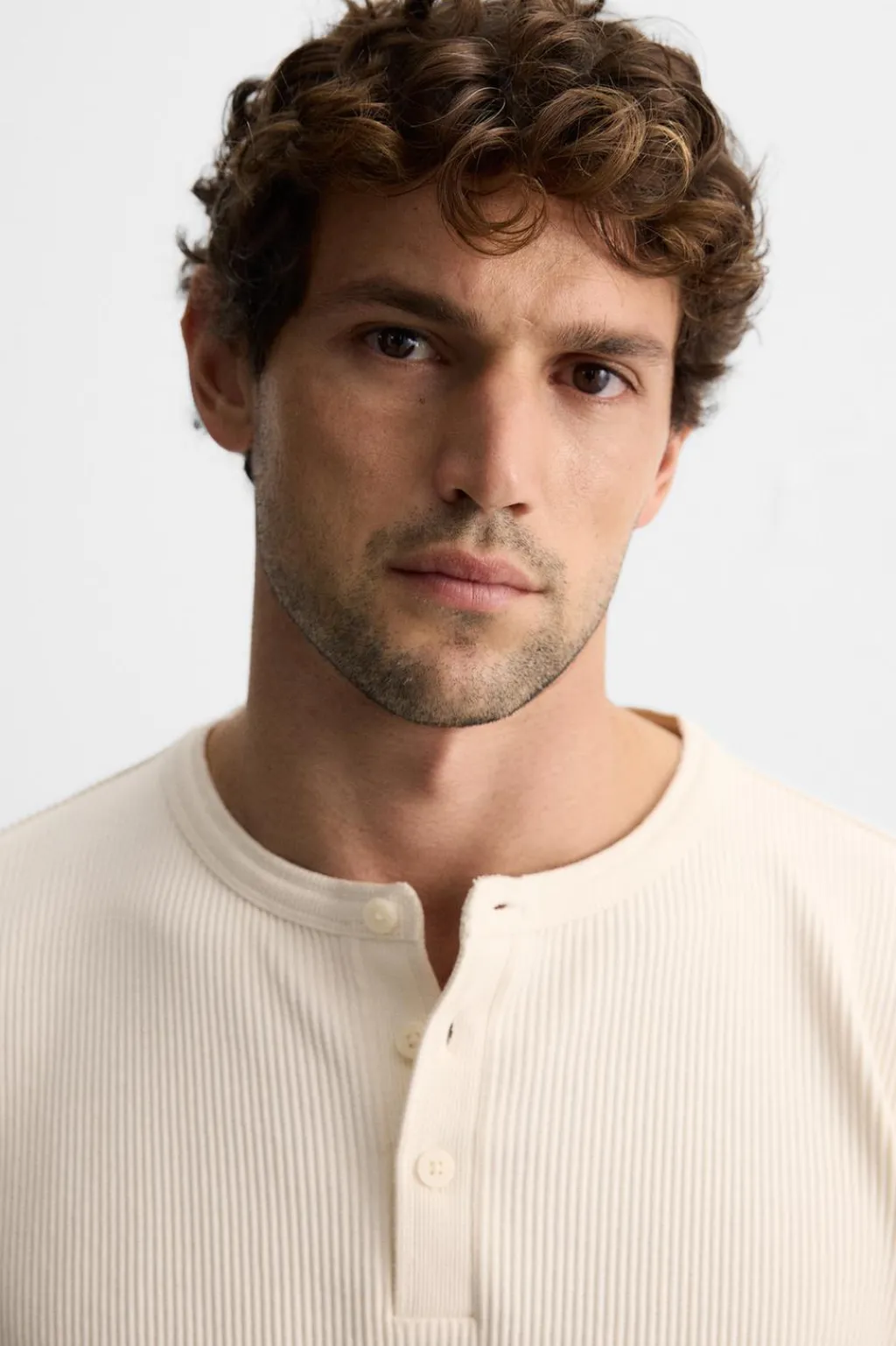 Camiseta relaxed fit. Cuello redondo con cierre frontal de botonadura. Manga larga. Acabados en rib.