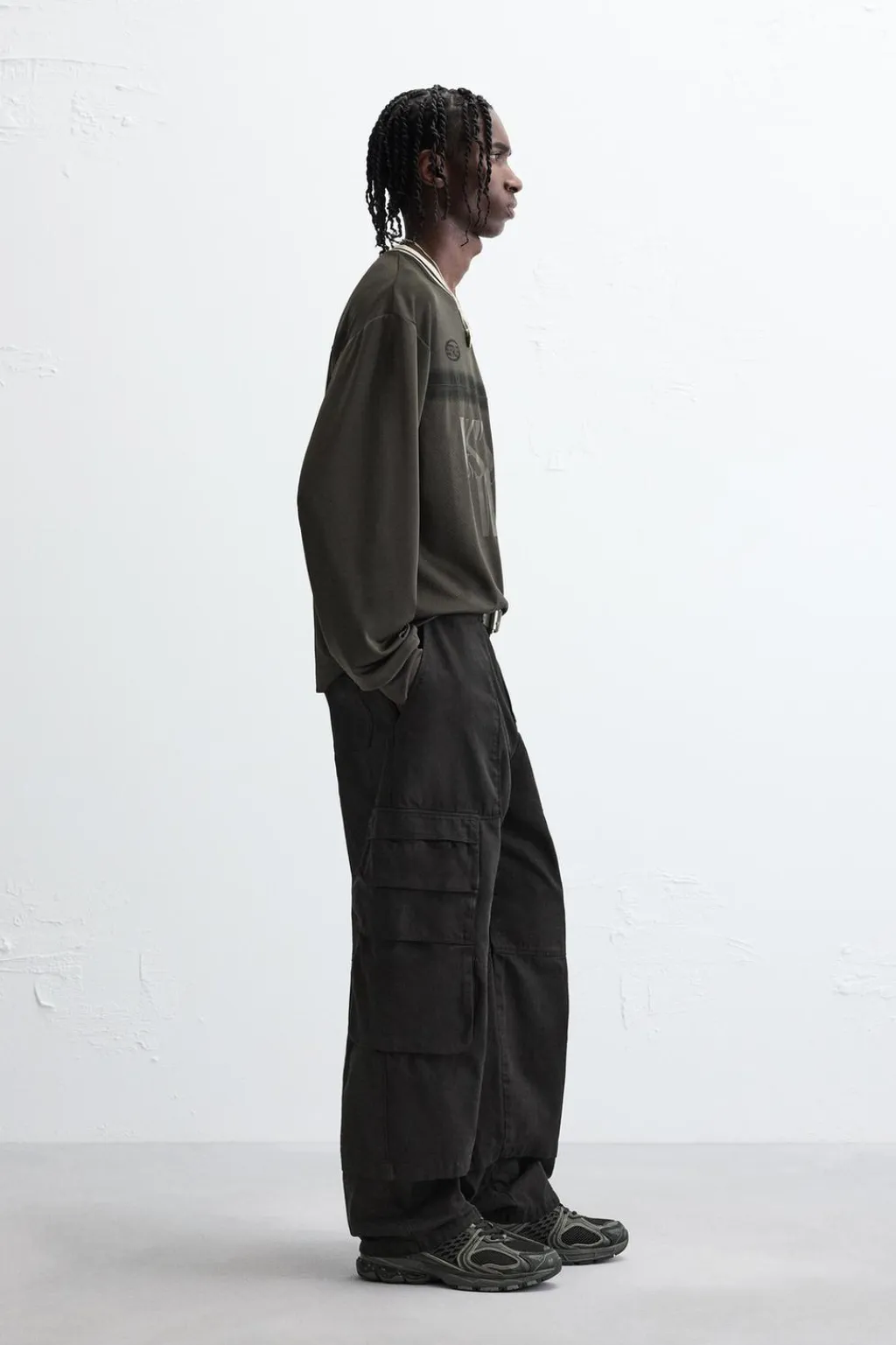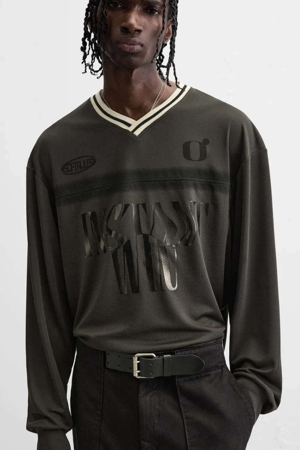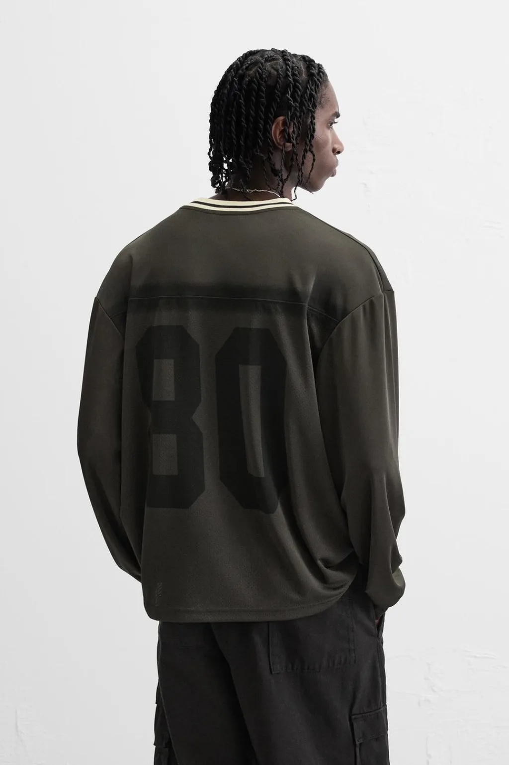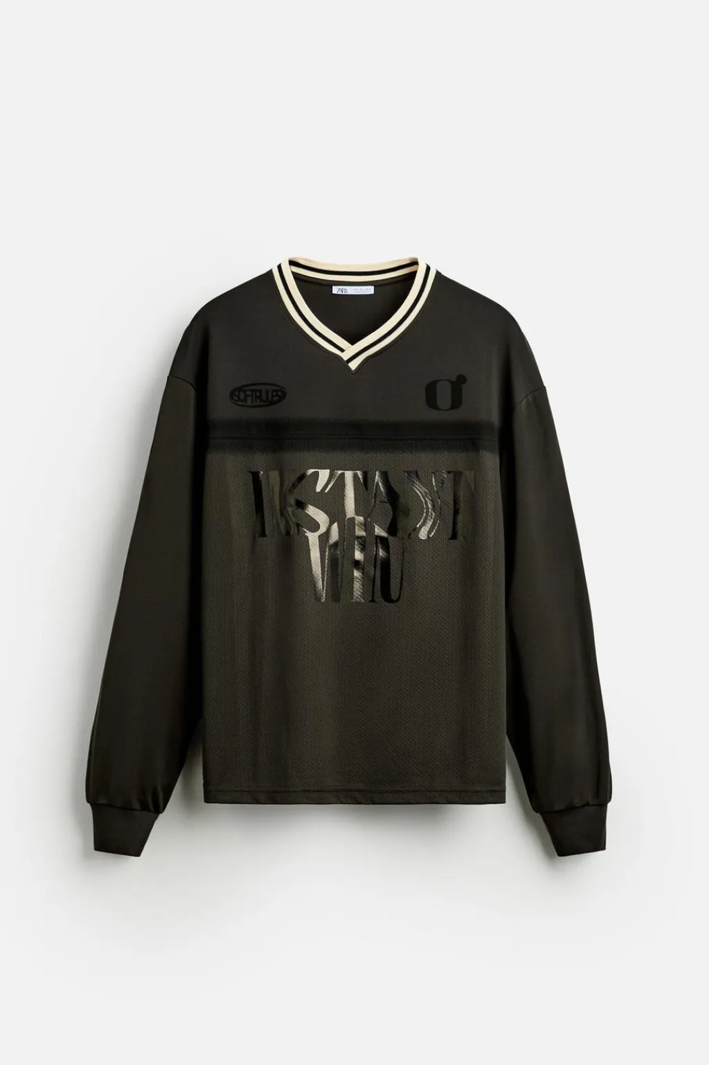 Camiseta relaxed fit confeccionada en tejido técnico. Cuello pico y manga larga acabada en rib. Estampados combinados a tono en delantero y espalda.