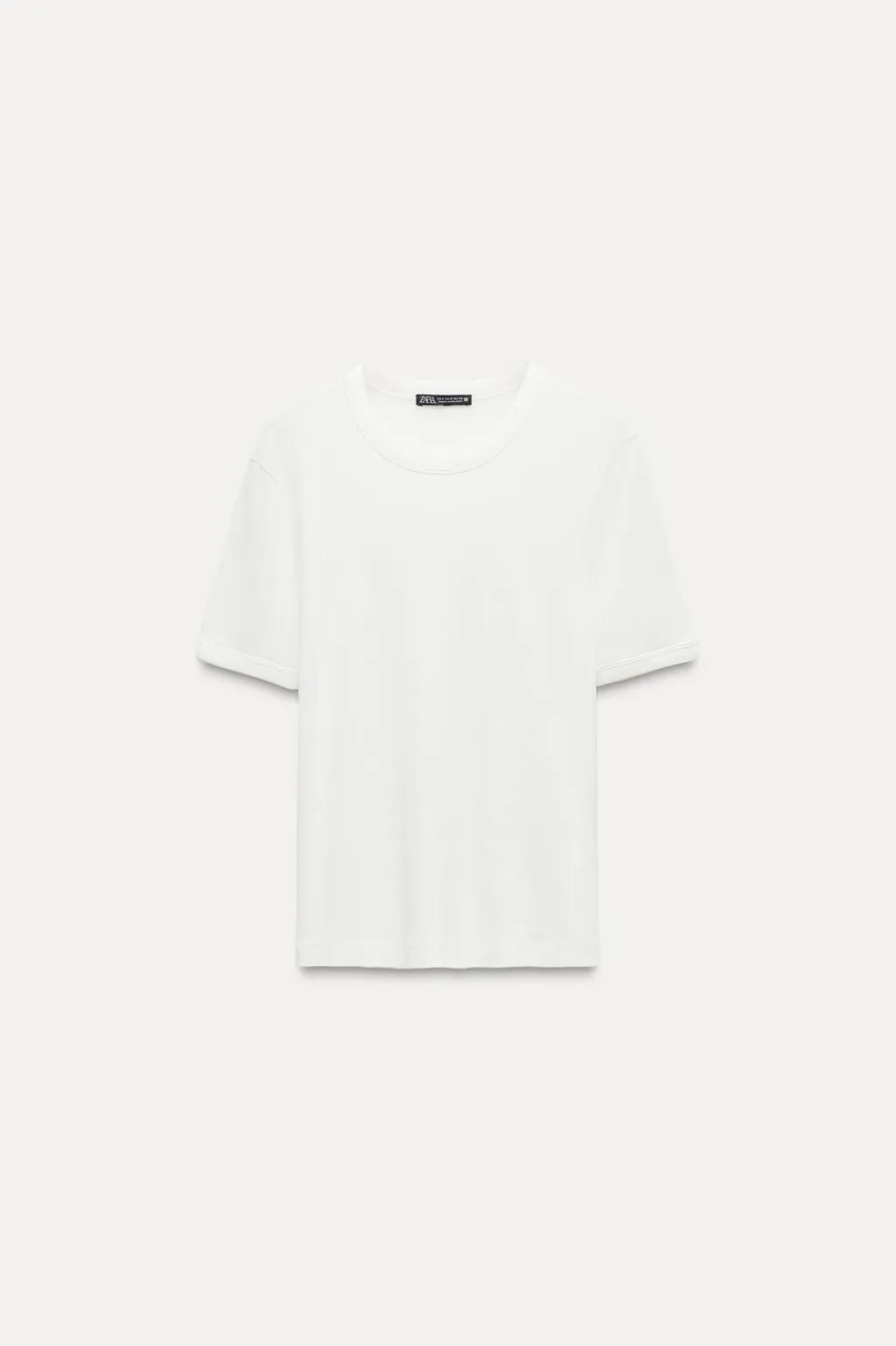 Camiseta confeccionada en hilatura con modal y con algodón. Cuello redondo y manga corta.