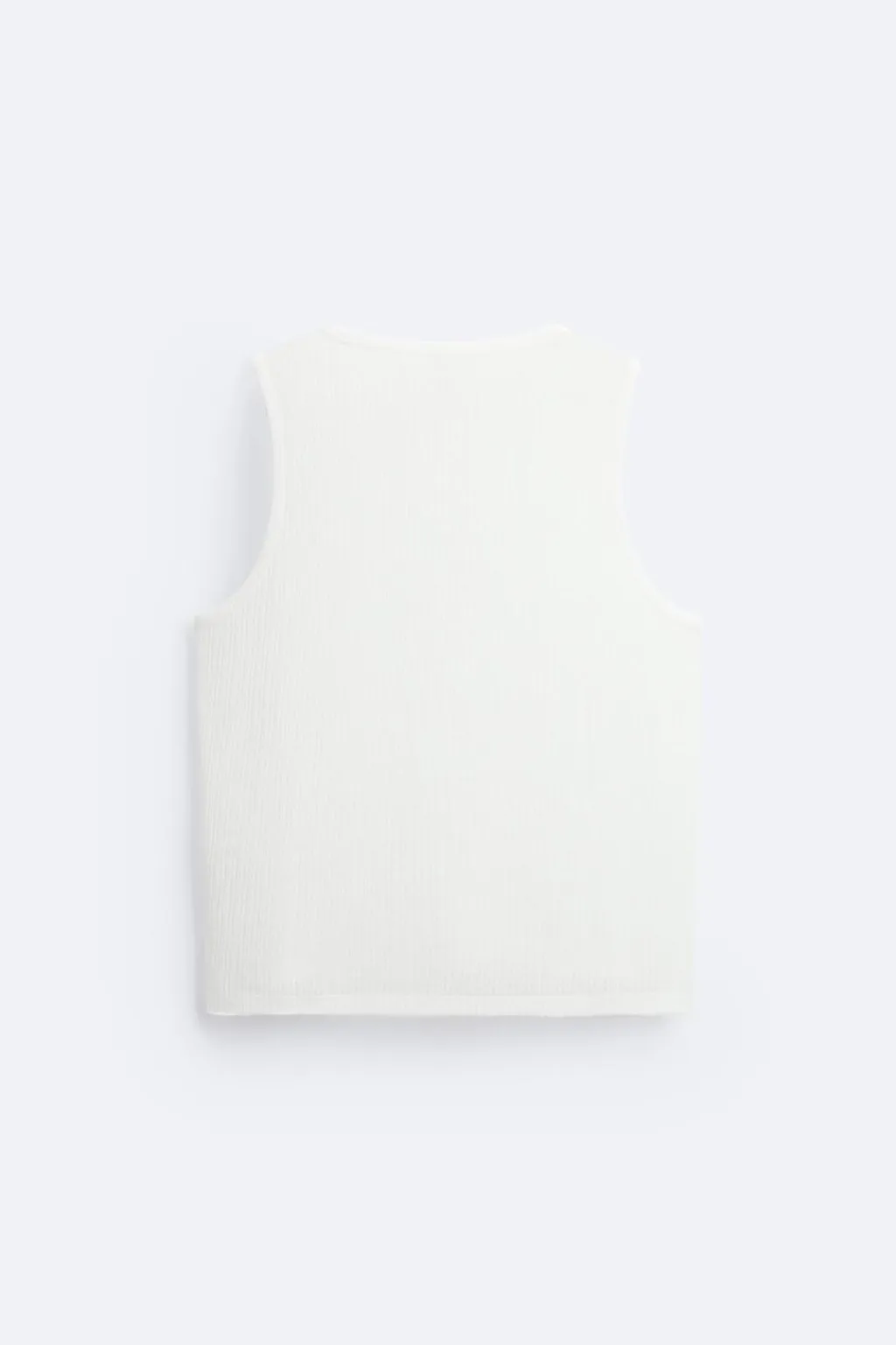 Camiseta confeccionada en tejido con estructura abierta. Cuello redondo amplio y manga sisa.