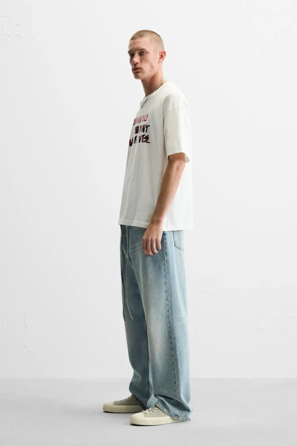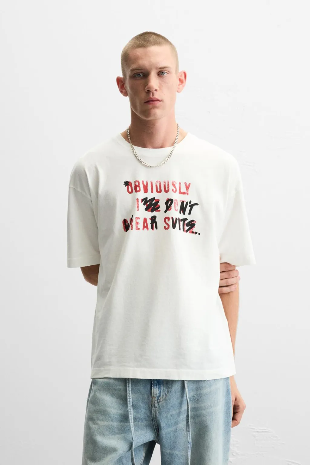 Camiseta relaxed fit. Cuello redondo y manga corta. Estampación frontal de texto combinado a contraste.