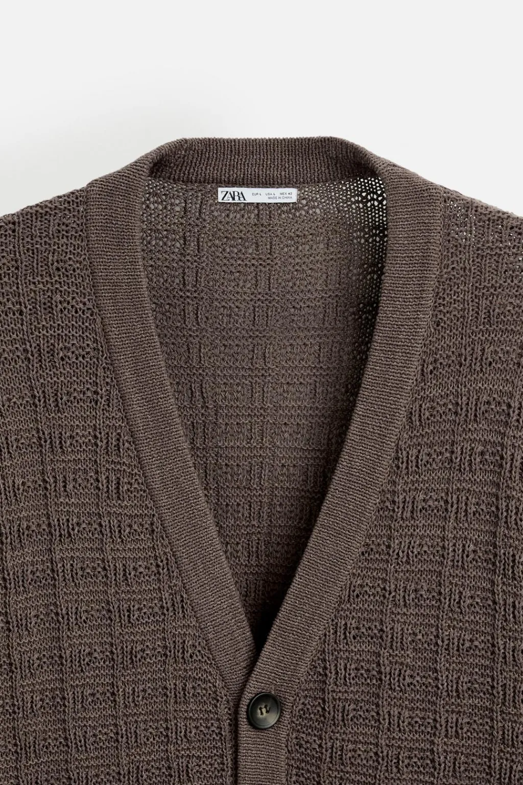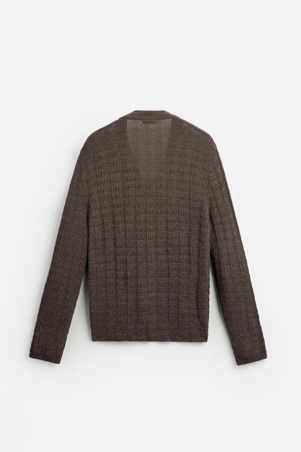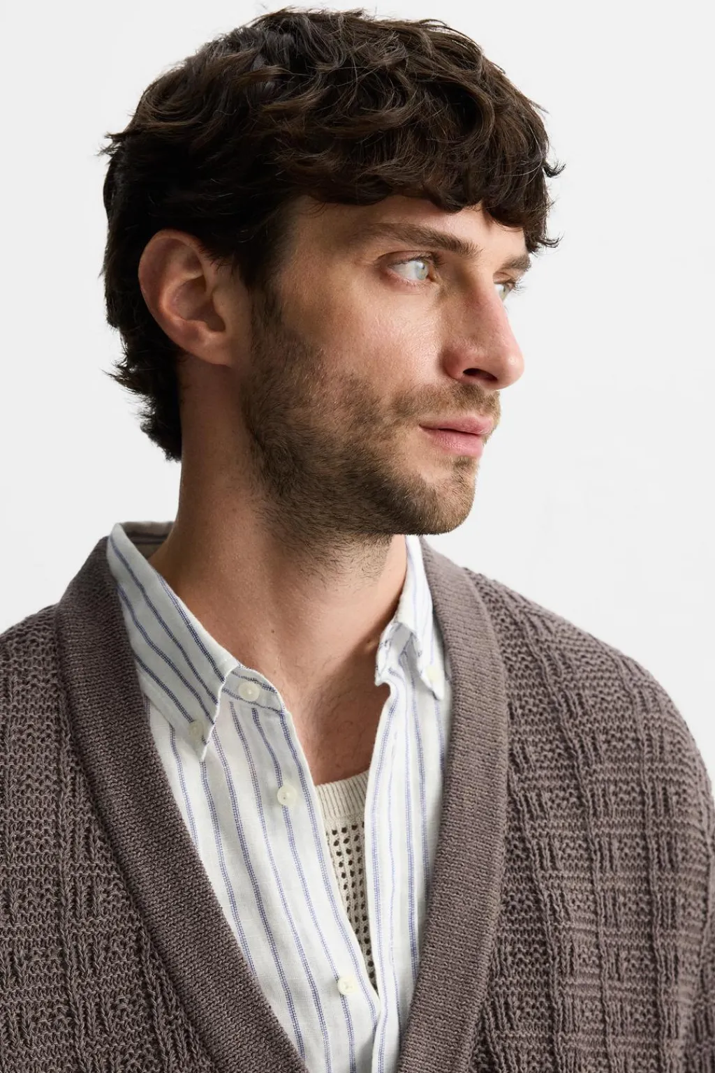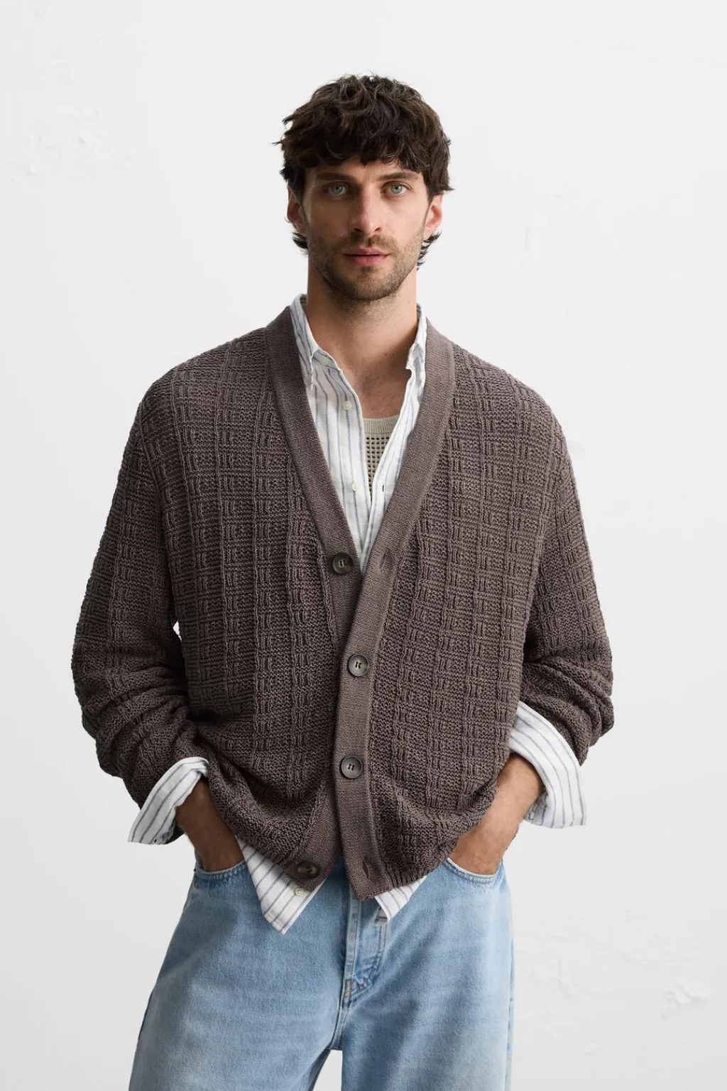 Cárdigan relaxed fit tejido en hilatura con algodón. Cuello pico y manga larga. Acabados en rib. Cierre frontal de botonadura.