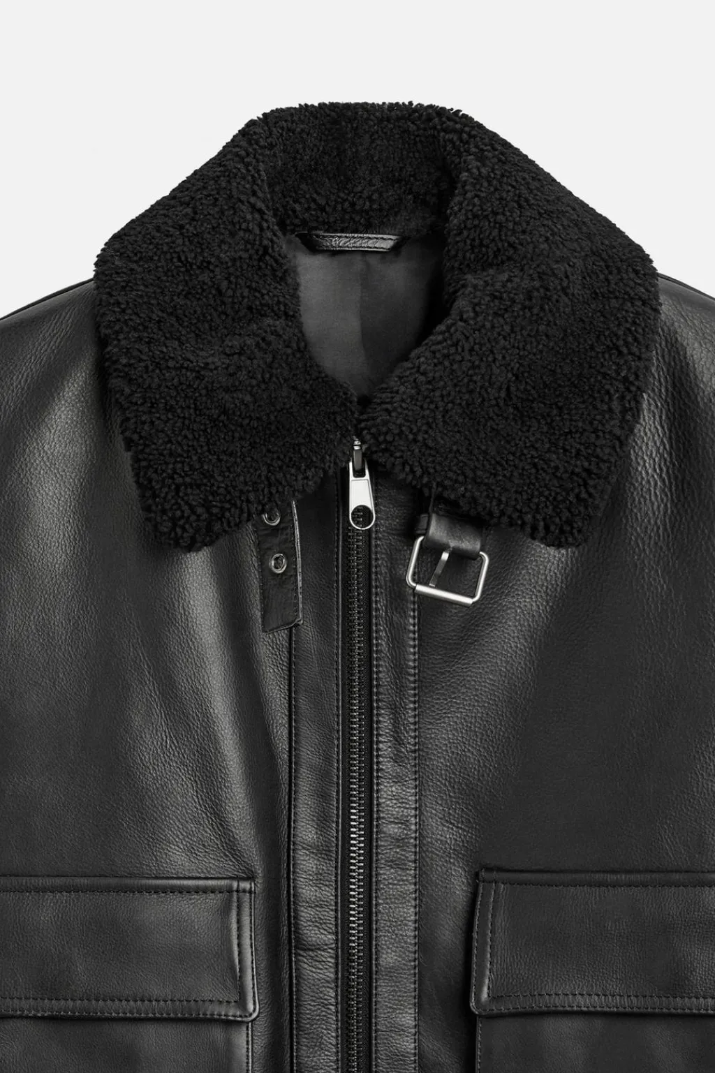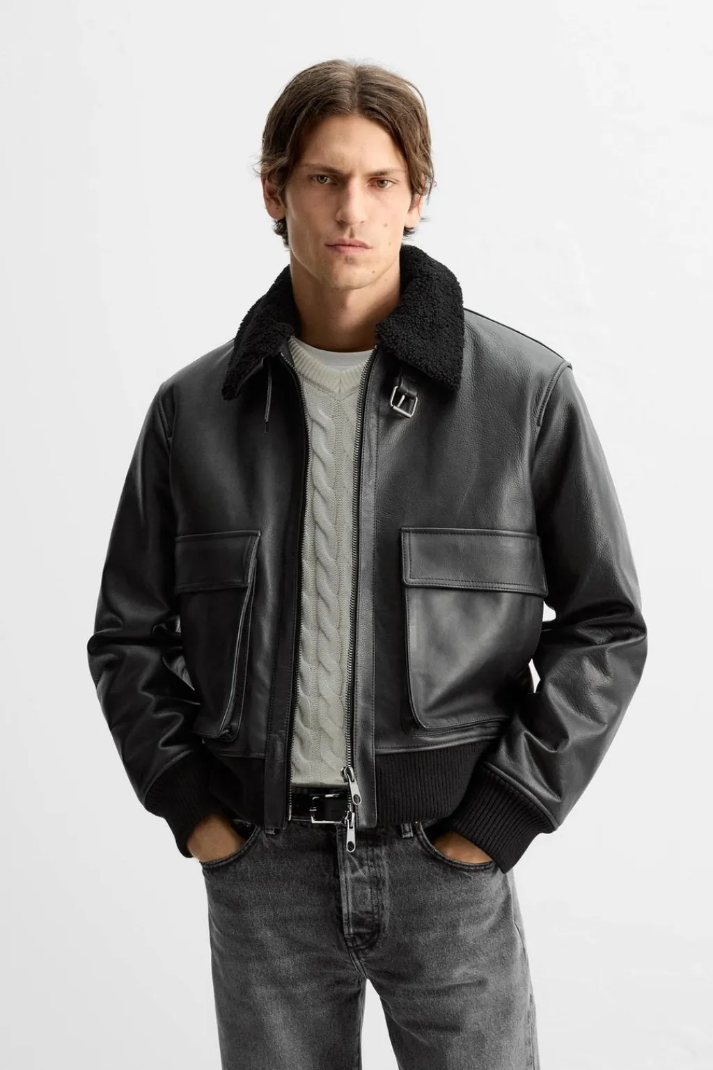 Cazadora relaxed fit confeccionada en piel. Cuello solapa con detalle de cuello efecto pelo desmontable. Manga larga. Bolsillos plastrón con solapa en cadera. Detalle de bolsillo en interior. Acabados en rib. Cierre frontal con cremallera oculta por solapa con botones a presión.