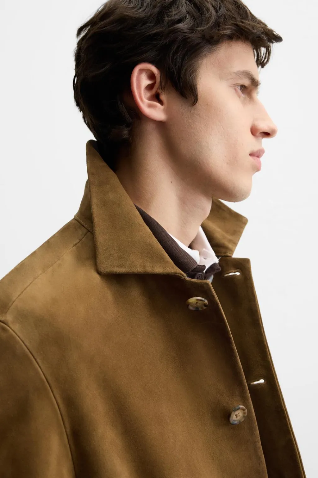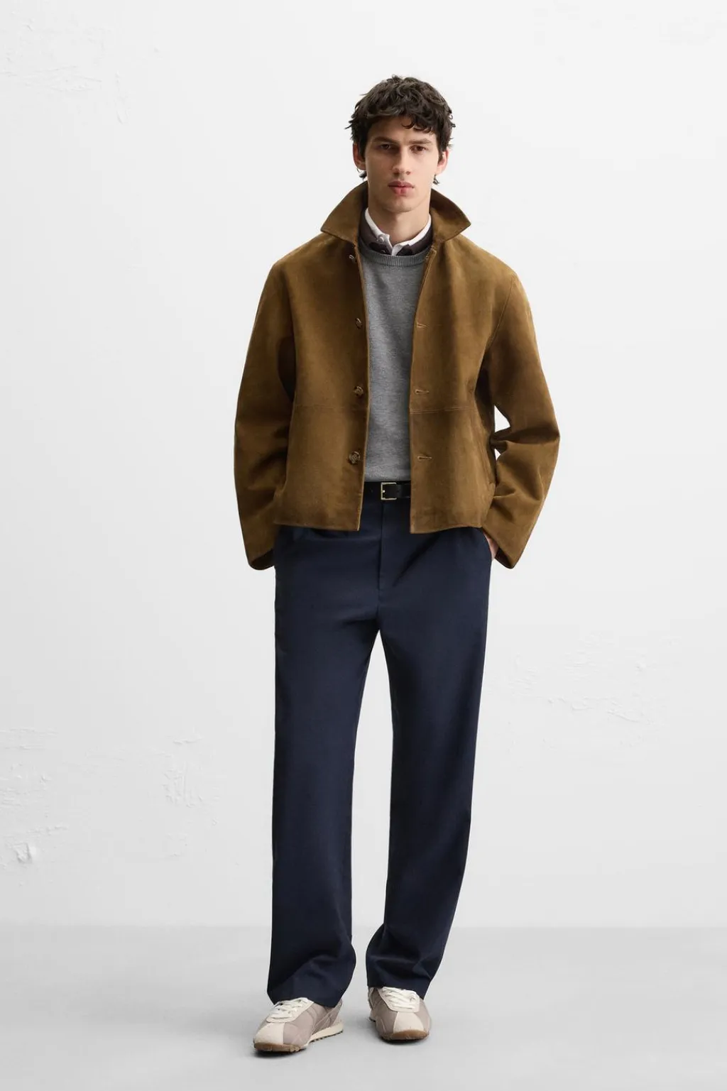 Cazadora cropped fit confeccionada en piel con acabado ante. Cuello solapa y manga larga. Bolsillos de vivo en cadera y detalle de bolsillo interior. Costuras con efecto envejecido. Cierre frontal con botones.