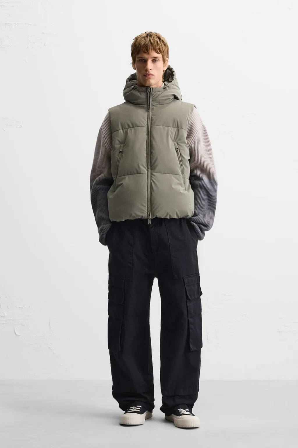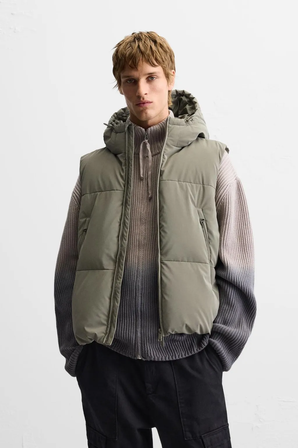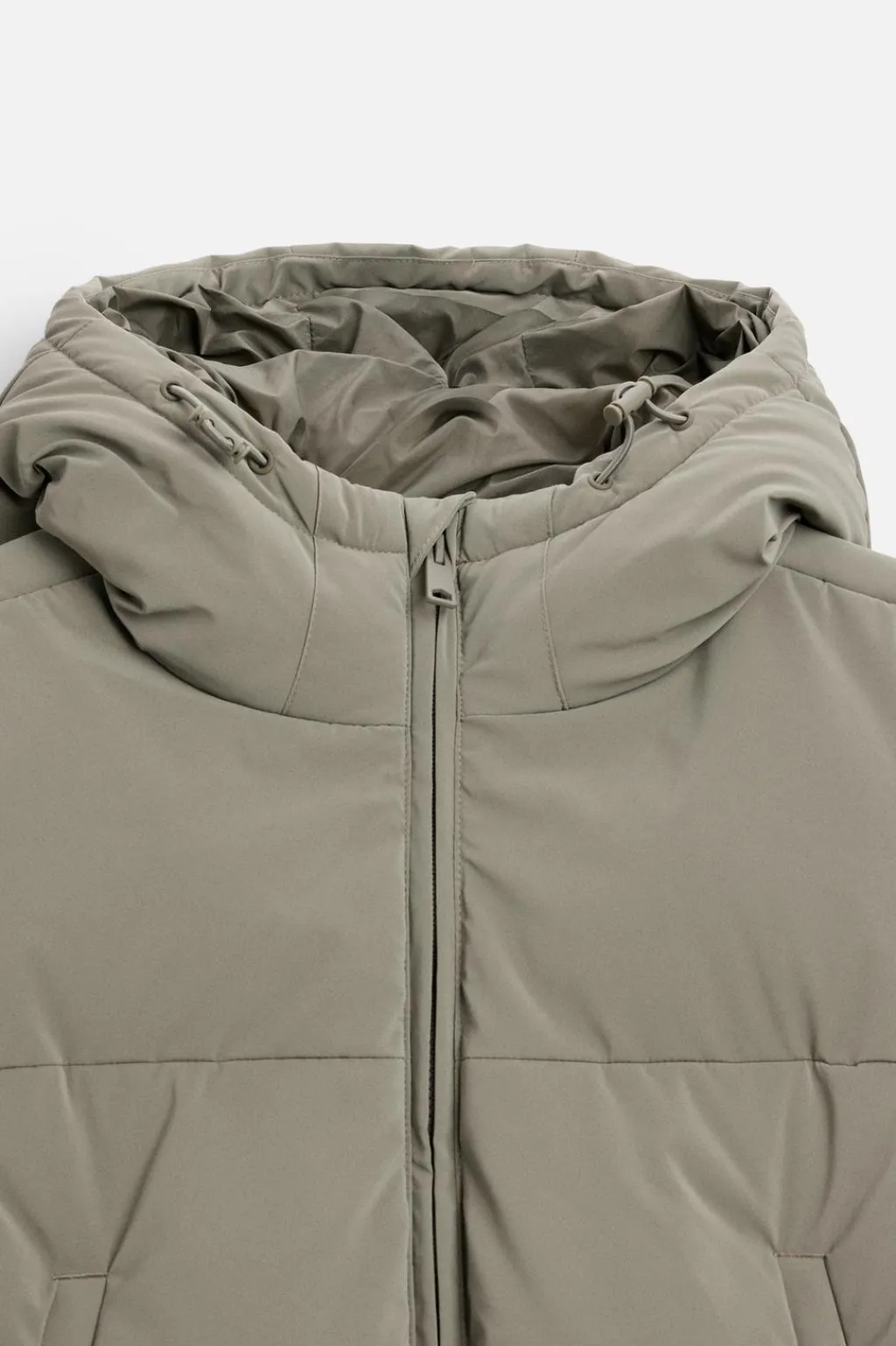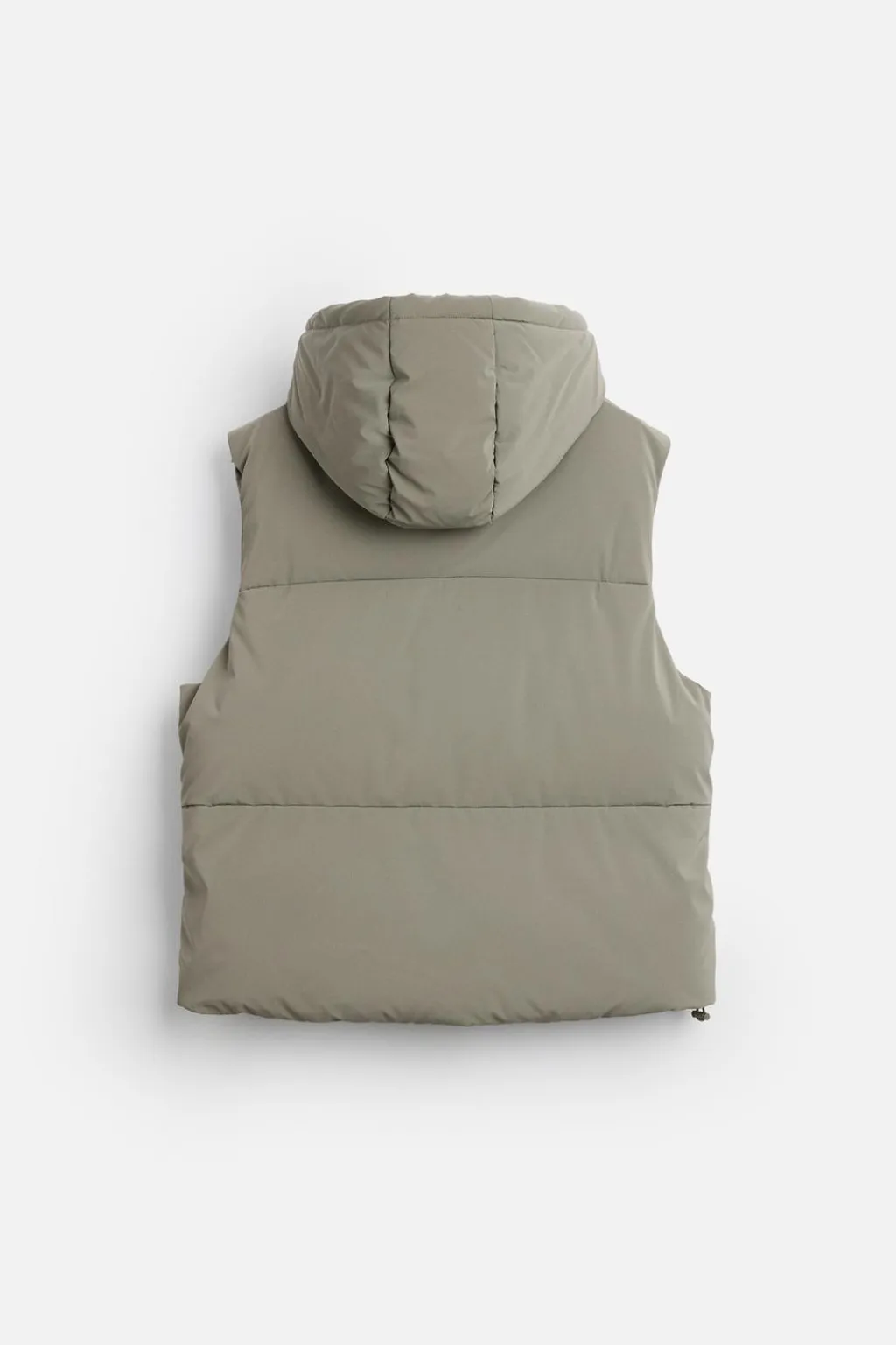 Chaleco acolchado confeccionado en tejido técnico con acabado engomado. Cuello subido con capucha ajustable y manga sisa. Bolsillos con cierre de cremallera en cadera y detalle de bolsillo interior. Bajo ajustable con elástico en laterales. Cierre frontal con cremallera oculta por solapas.