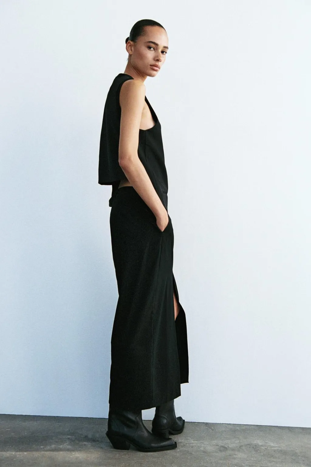 Chaleco de escote pico y manga sisa. Falsos bolsillo de vivo en delantero. Detalle de tejido satinado en espalda. Cierre frontal con botones.