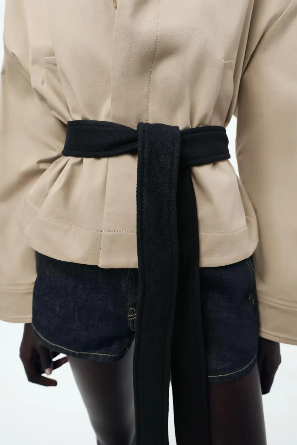 Chaqueta confeccionada en hilatura con mezcla de algodón. Cuello solapa y manga larga acabada en puño. Bolsillos delanteros. Cinturón en tejido a contraste. Cierre frontal con botones ocultos por solapa.