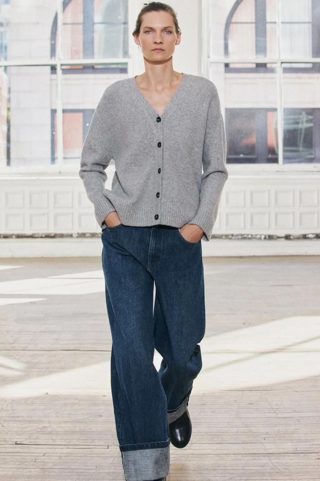 Chaqueta de punto liso con escote pico y manga larga. Bajo con aberturas laterales. Acabados en rib. Cierre frontal con botones.