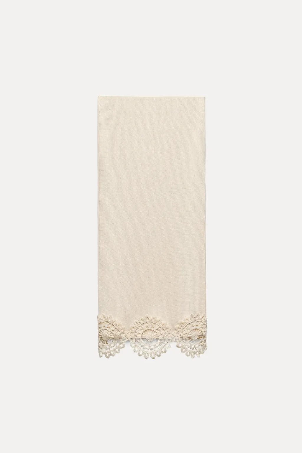 Falda midi de tiro alto y cintura con elástico interior. Bajo con aplicaciones de crochet.