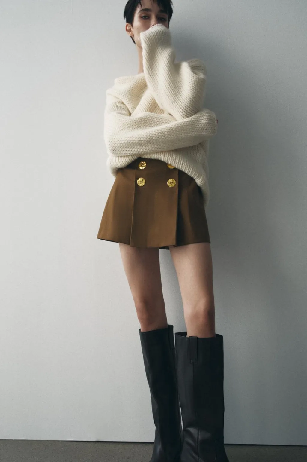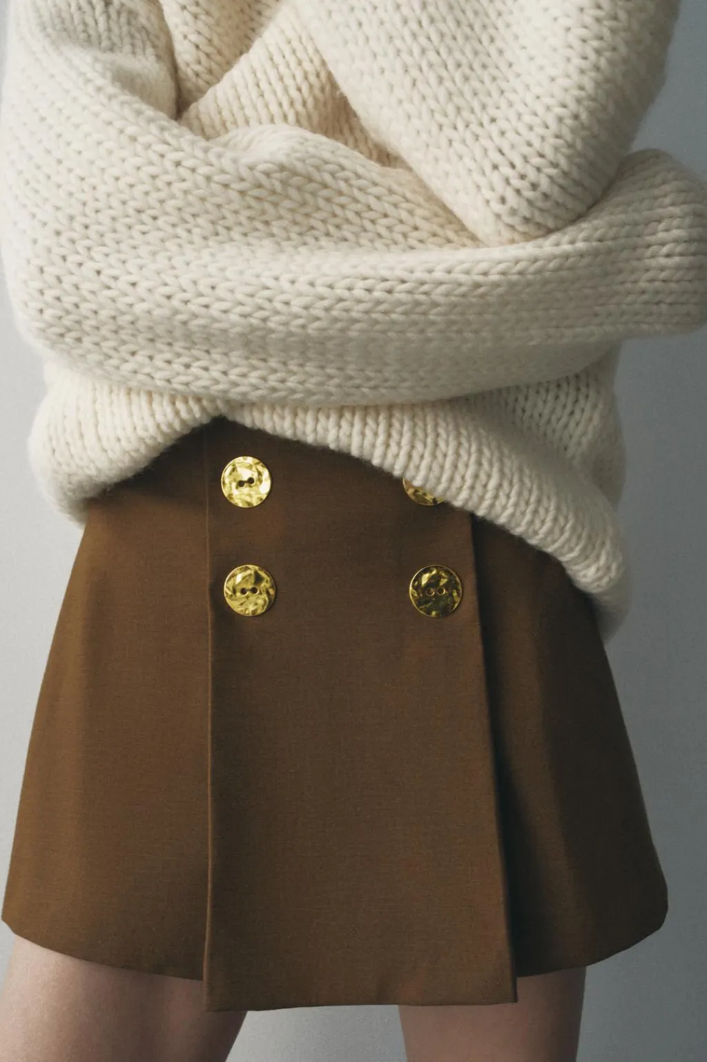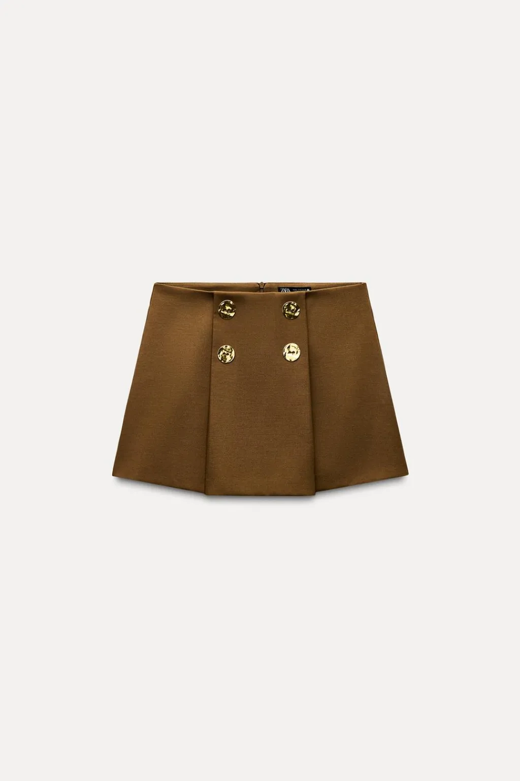 Falda corta de tiro medio con detalle de tablas. Botones metálicos en delantero. Cierre en espalda con cremallera oculta en costura.