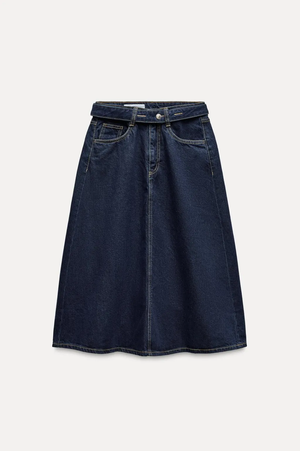 Falda midi de tiro medio con trabillas y cinco bolsillos. Cinturón en mismo tejido. Detalle de costuras a contraste. Cierre frontal con cremallera y botón metálico.