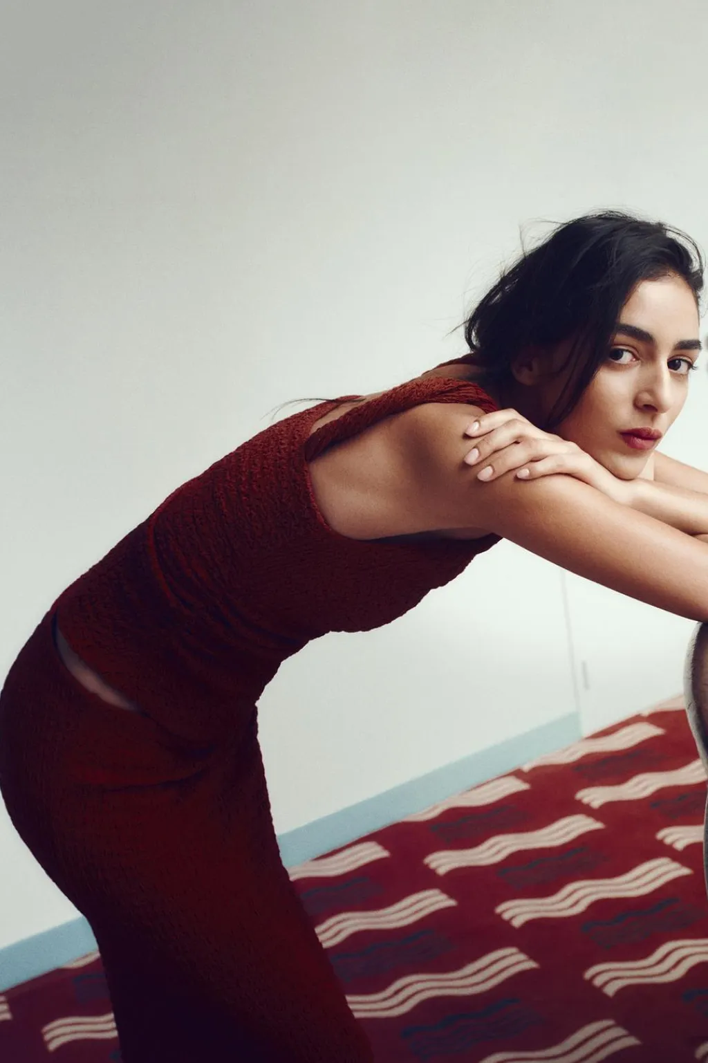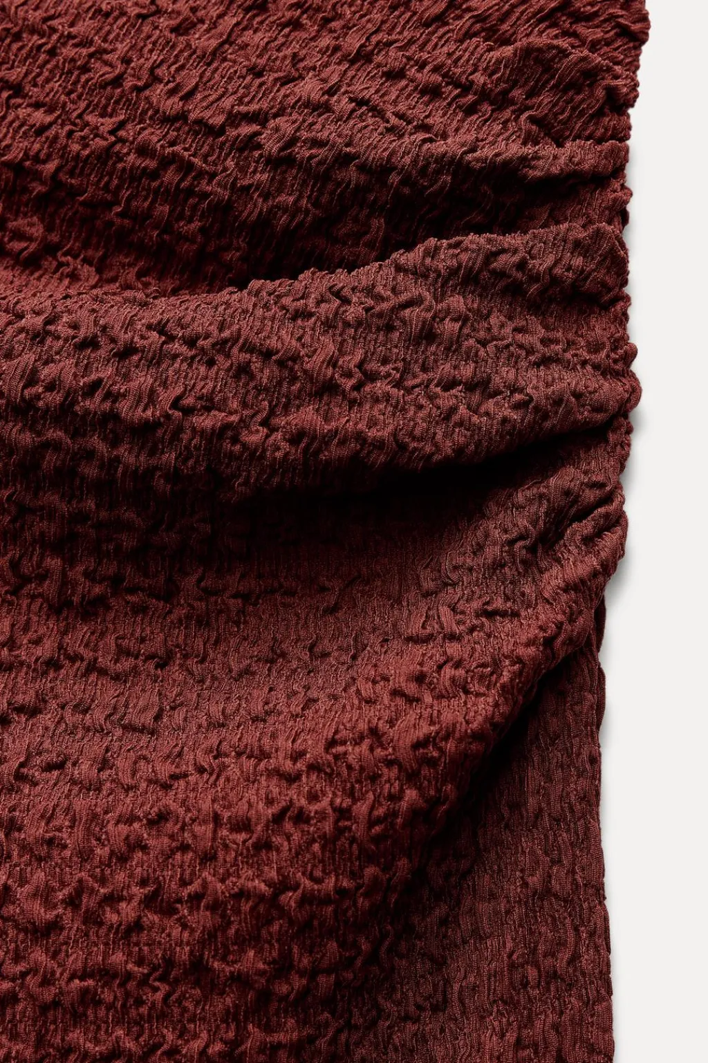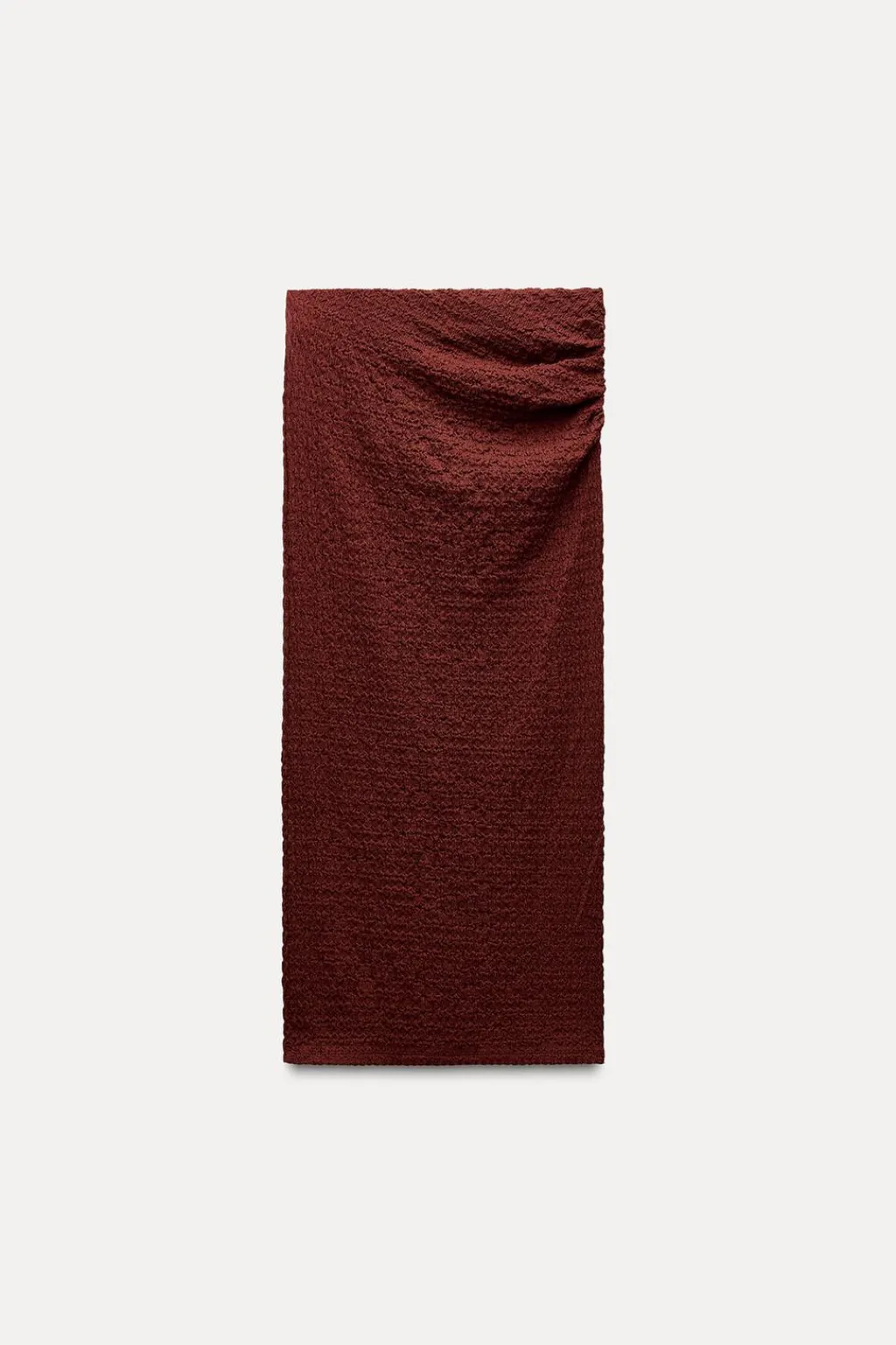Falda midi de tiro medio y cintura con elástico interior. Detalle de drapeado lateral y tejido con textura.