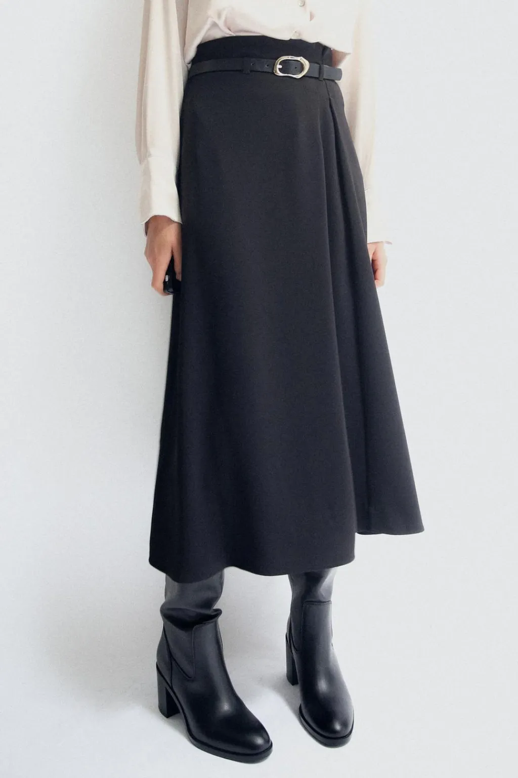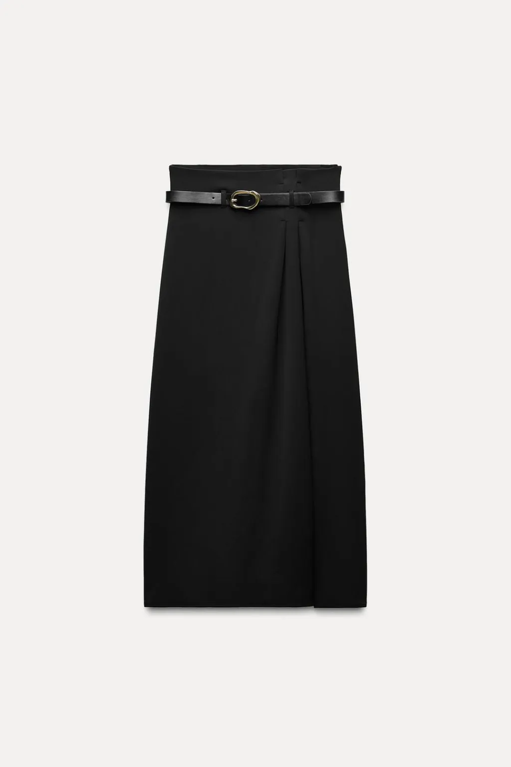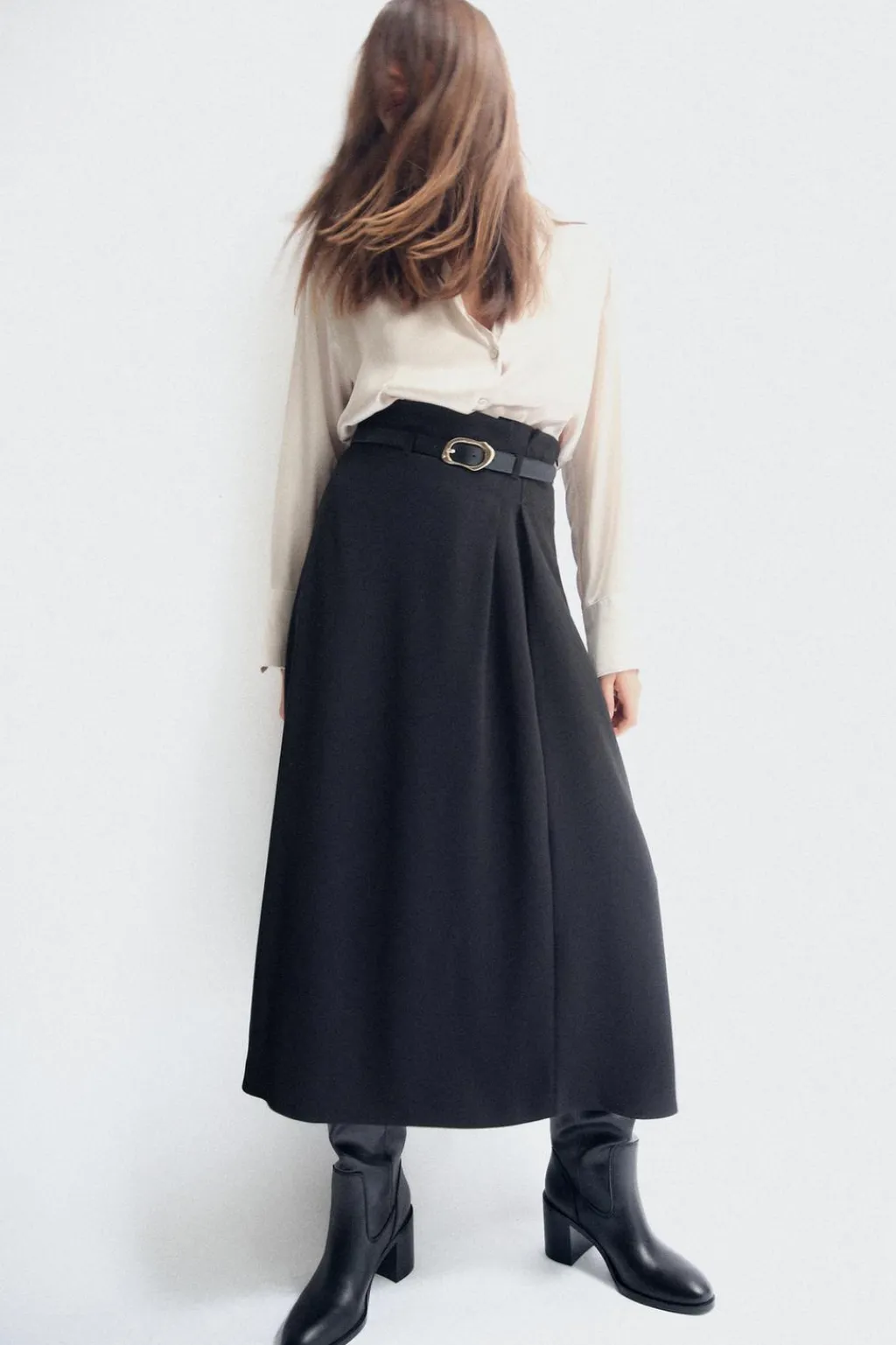 Falda de tiro alto con cinturón. Cierre lateral con cremallera oculta en costura.