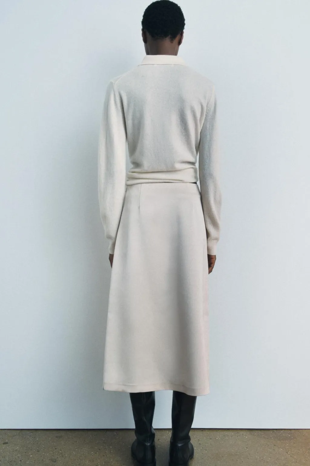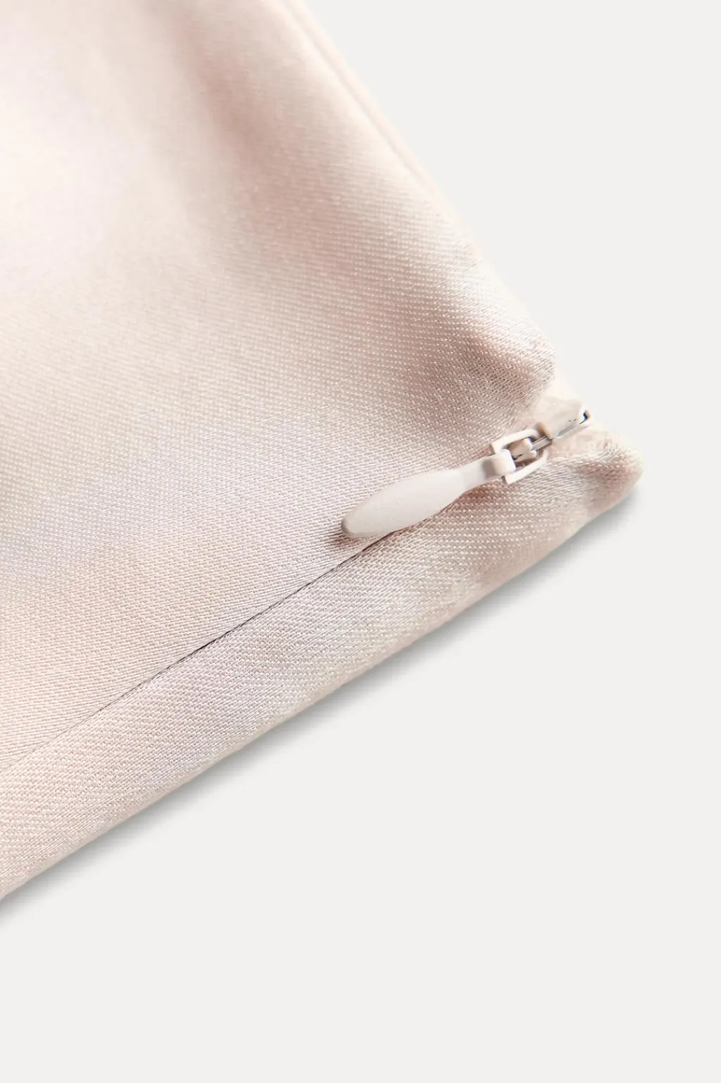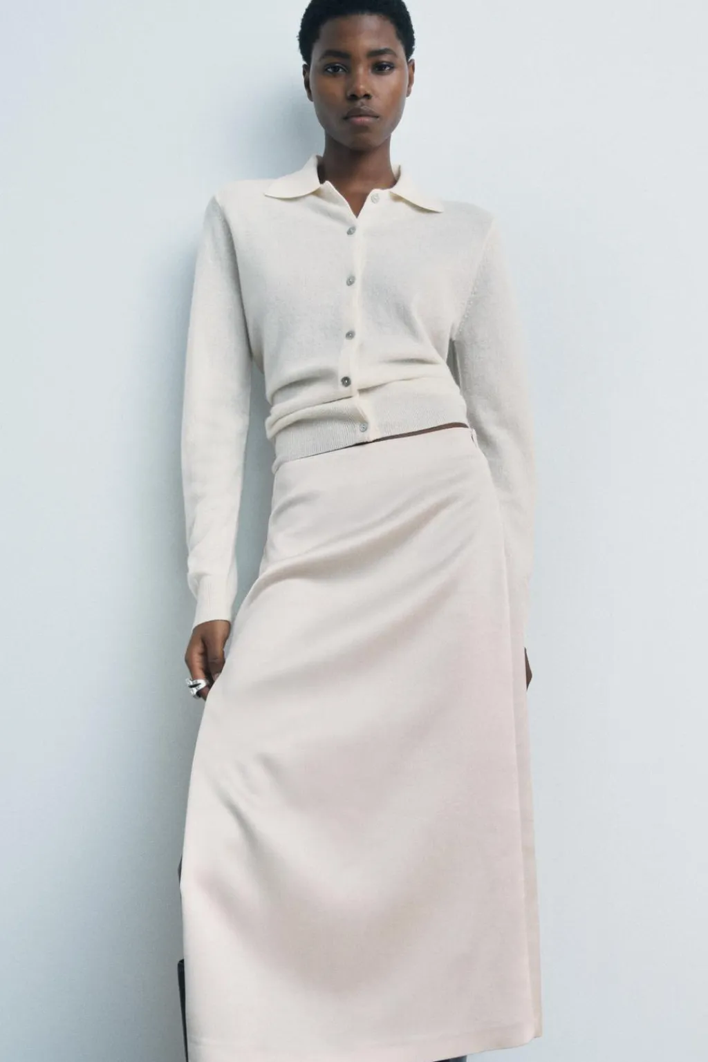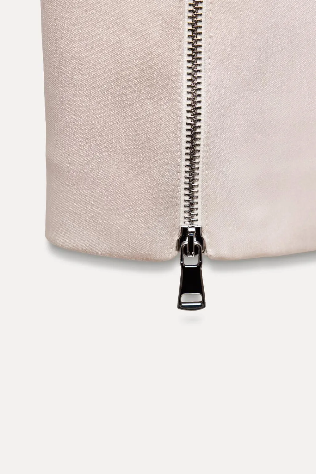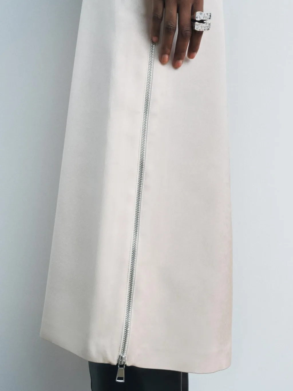Falda midi de tiro medio. Detalle de cremallera metálica en delantero. Bajo acabado en línea evasé. Cierre lateral con cremallera oculta en costura.