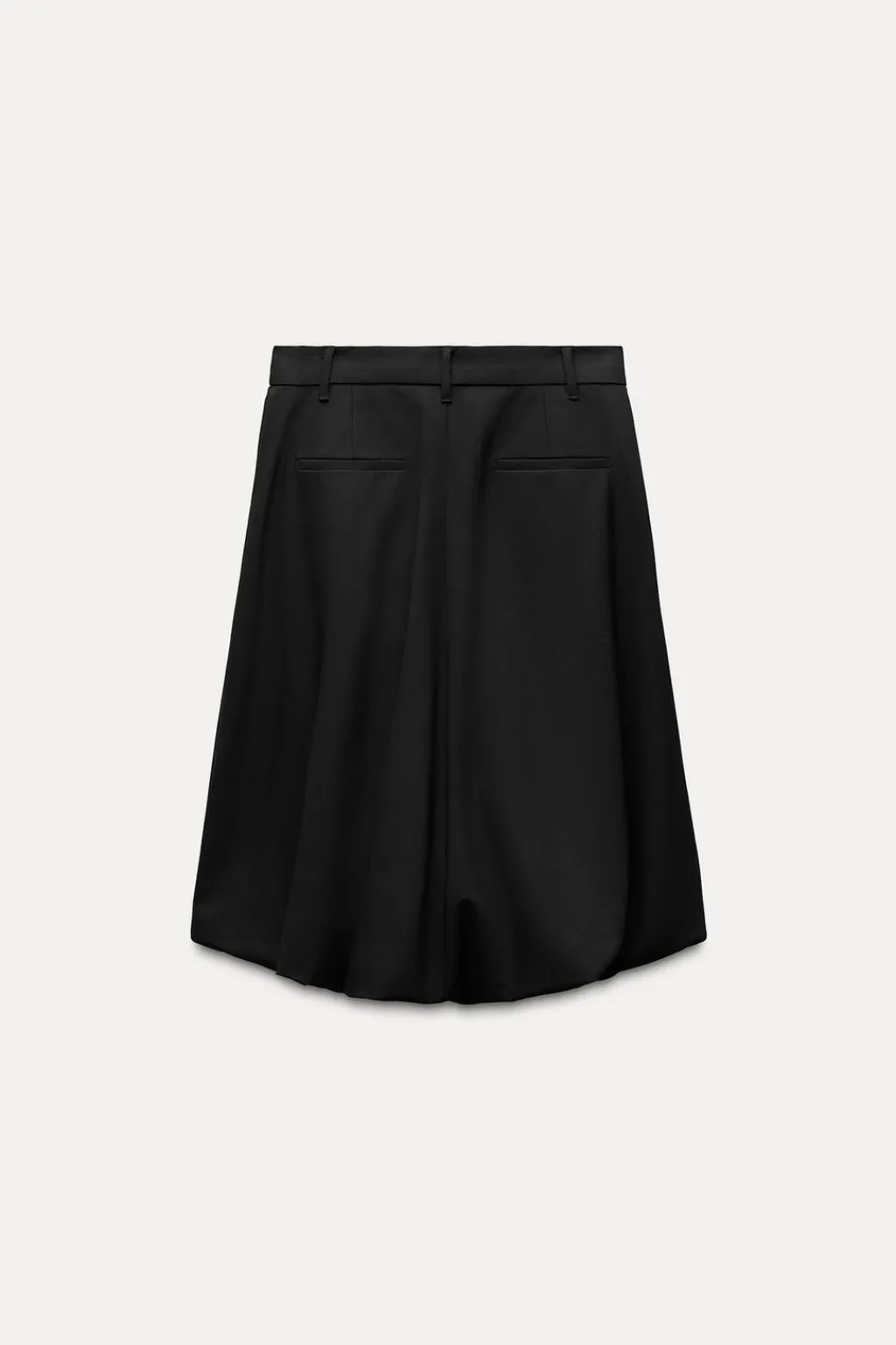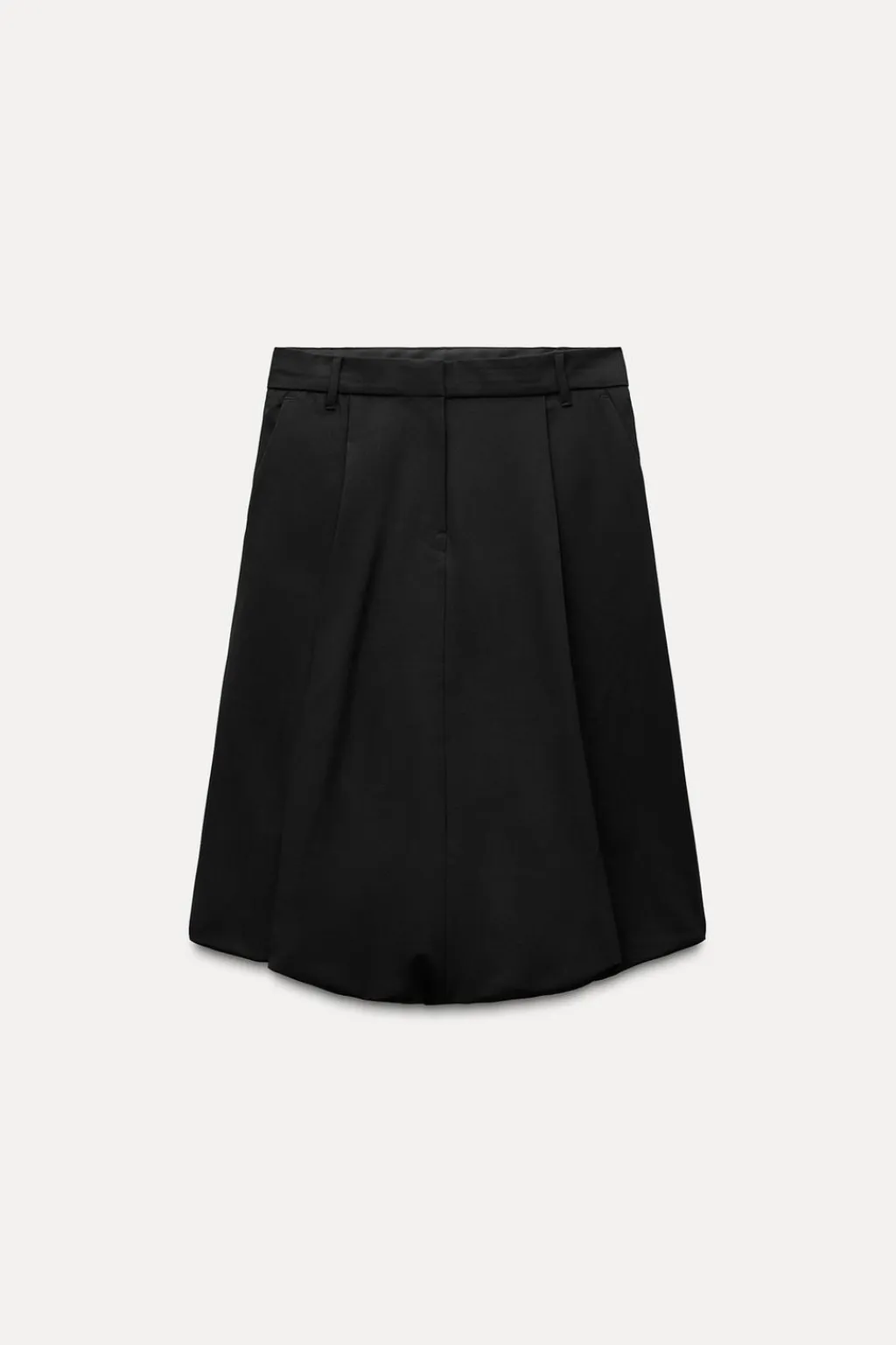 Falda midi de tiro medio con trabillas. Bolsillos laterales y falsos bolsillos de vivo en espalda. Detalle de pinzas en delantero. Bajo acabado globo. Forro interior. Cierre frontal con cremallera, botón interior y gancho metálico.