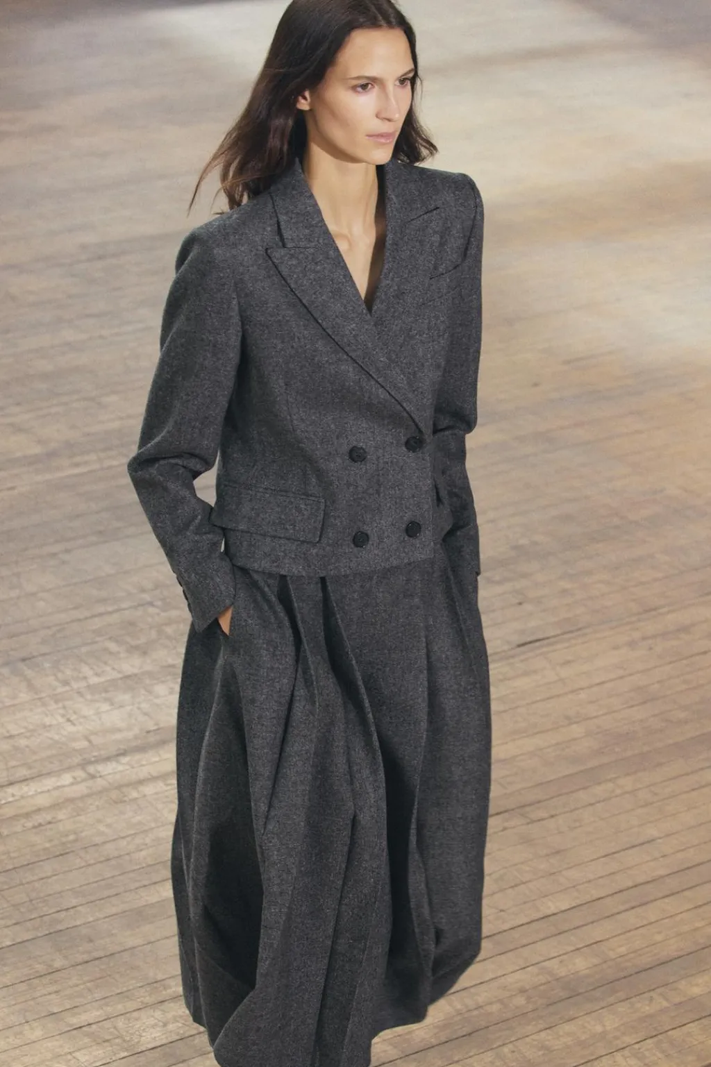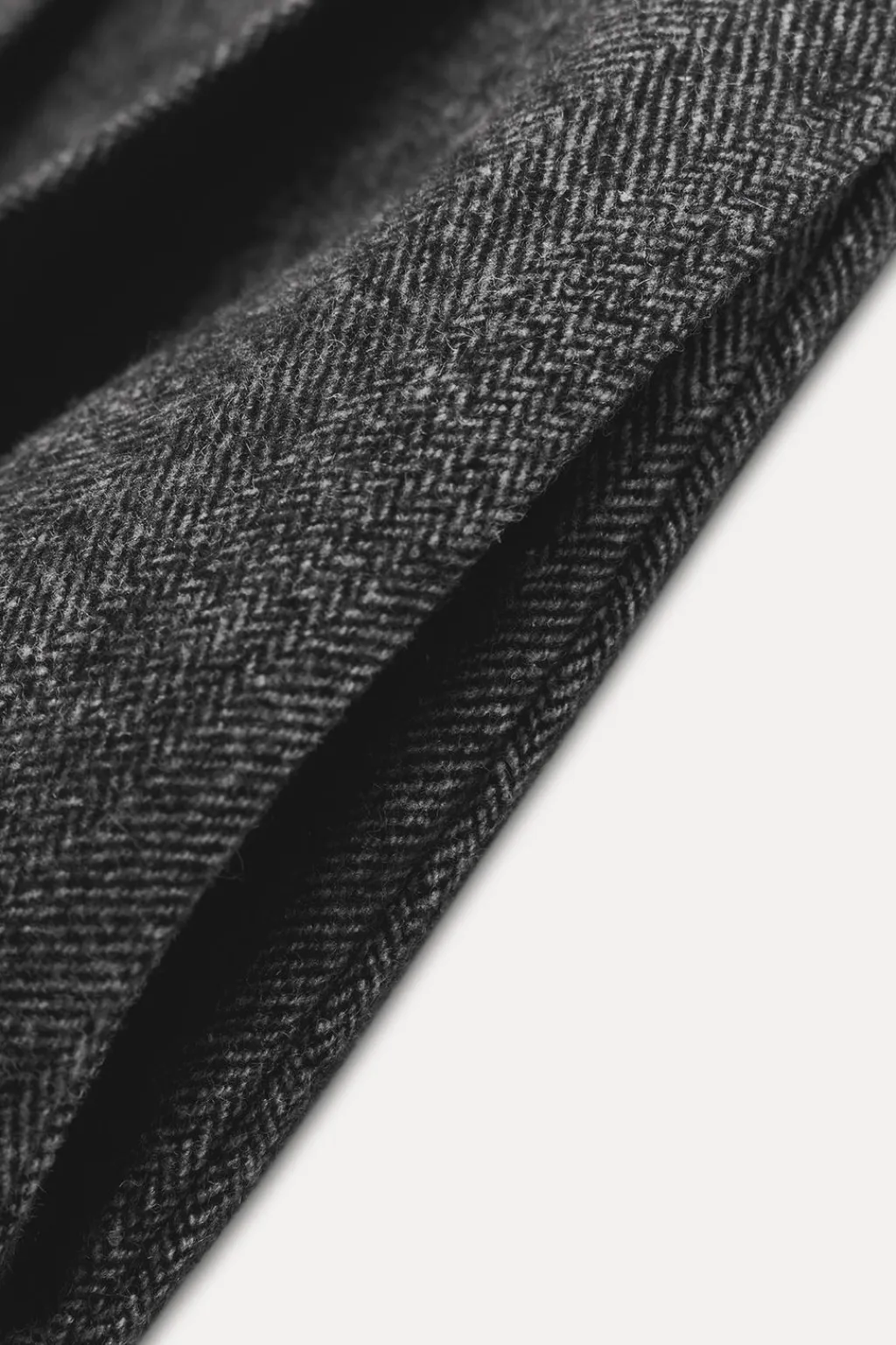 Falda midi de tiro medio confeccionada en hilatura con lana 30%. Detalle de tablas en delantero. Bajo acabado en línea evasé. Cierre con cremallera oculta en costura.