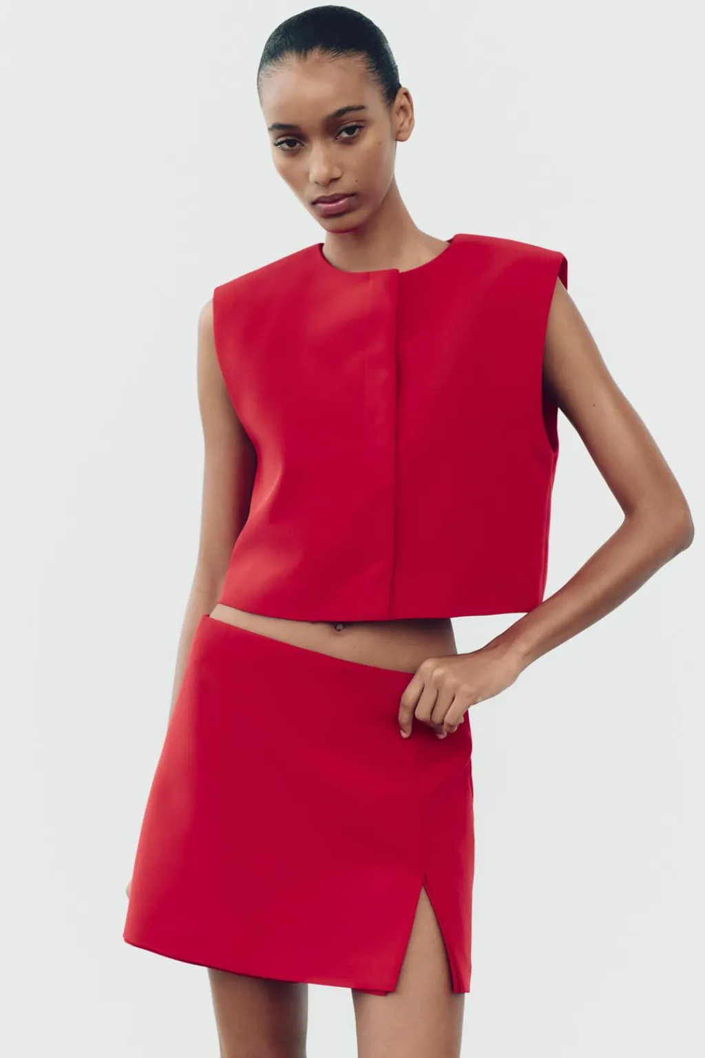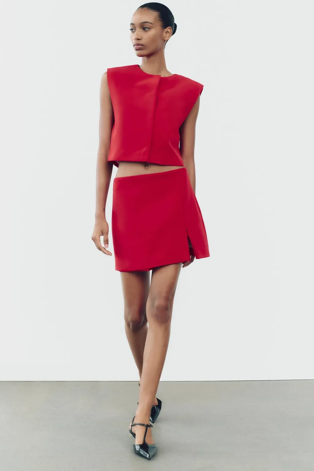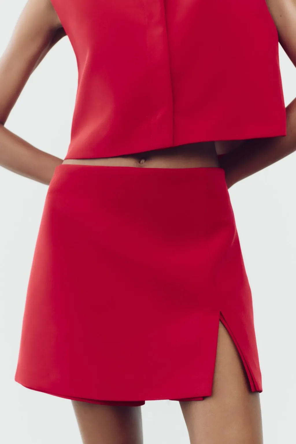 Falda pantalón de tiro alto con abertura en el bajo. Cierre lateral con cremallera oculta en costura.