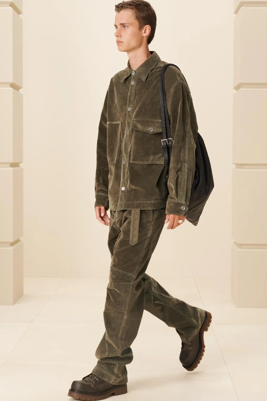 Pantalón relaxed straight fit confeccionados en tejido de algodón con acabado efecto terciopelo lavado. Cintura ajustable con cinturón del mismo tejido Bolsillos frontales y detalle de bolsillos traseros asimétricos de plastrón. Pespuntes combinados a contraste. Cierre frontal con con botones.