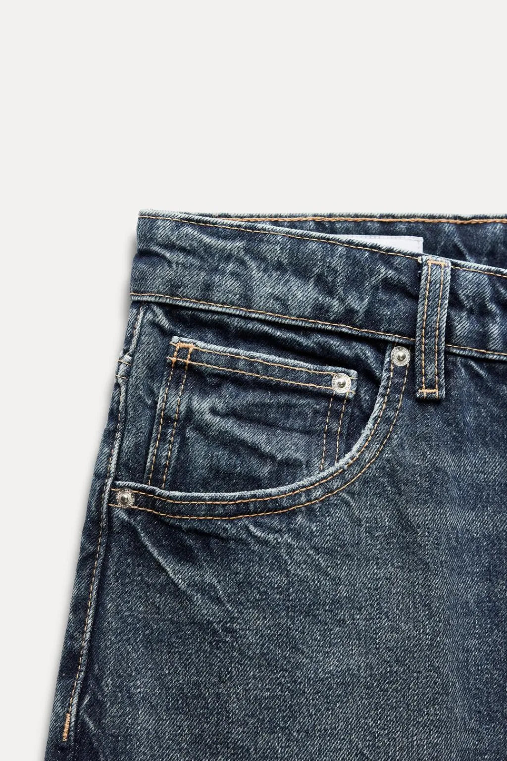 Jeans de tiro alto con cinco bolsillos. Efecto lavado. Cierre frontal con cremallera y botón.