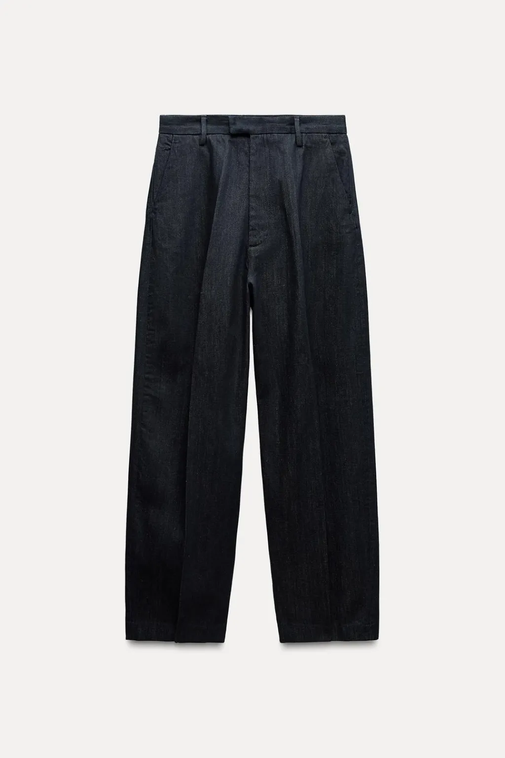 Jeans de tiro medio y cintura con trabillas. Bolsillos laterales ocultos en costura. Detalle de raya planchada en delantero. Cierre frontal con cremallera, botón y gancho metálico.