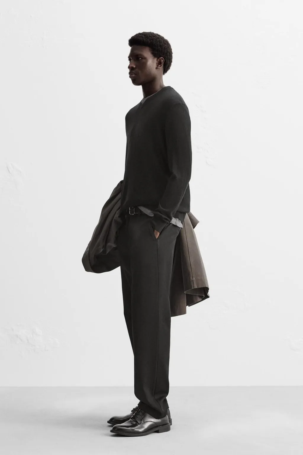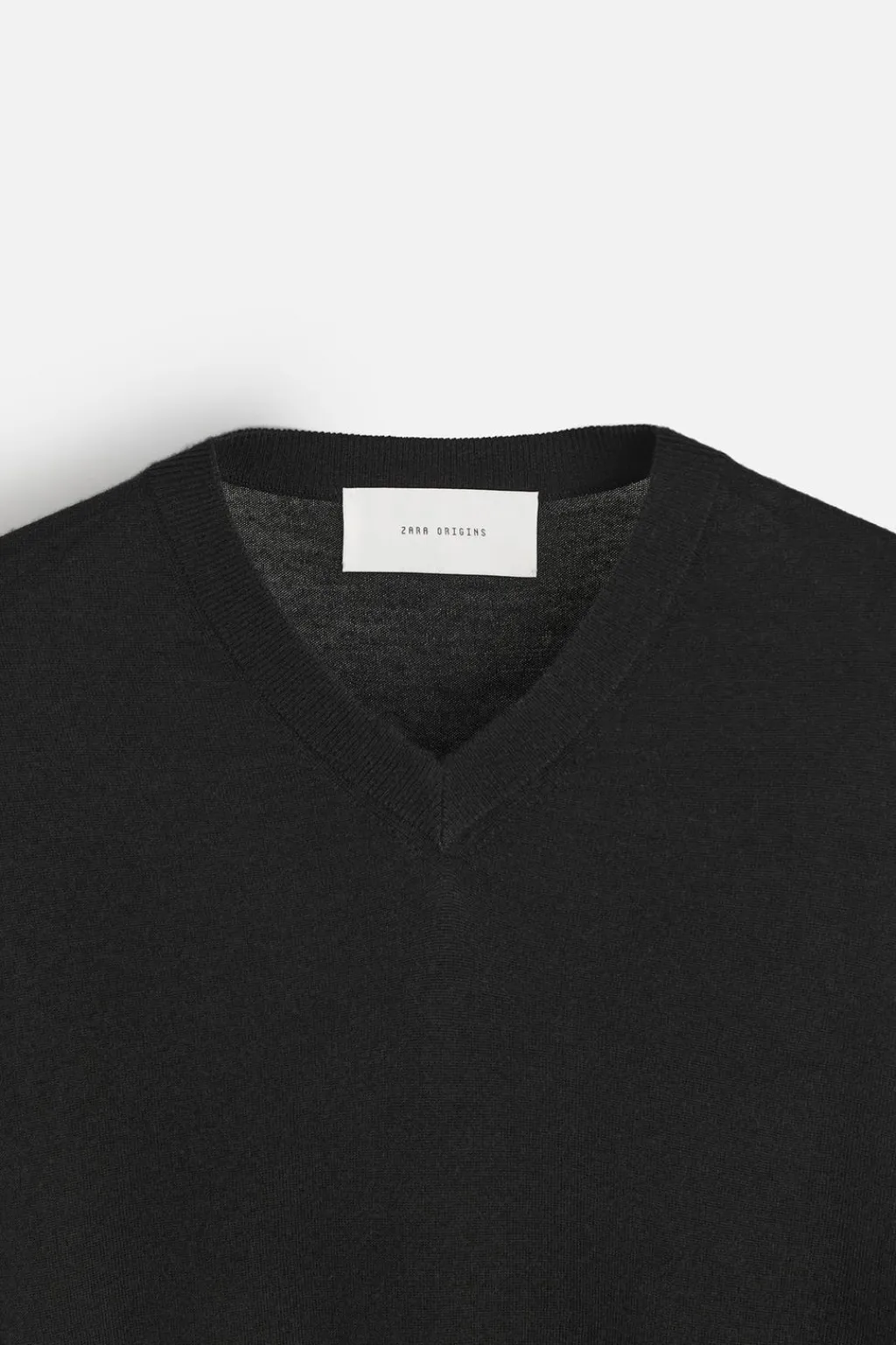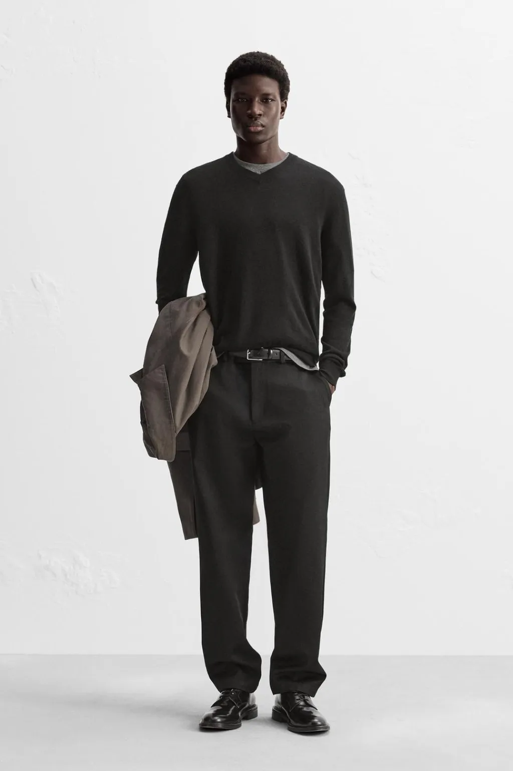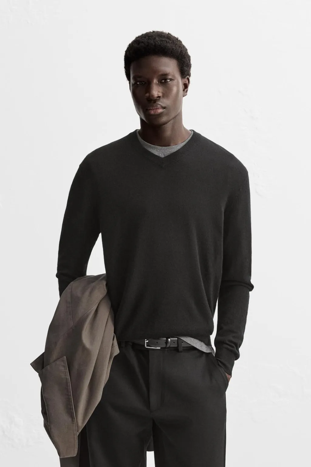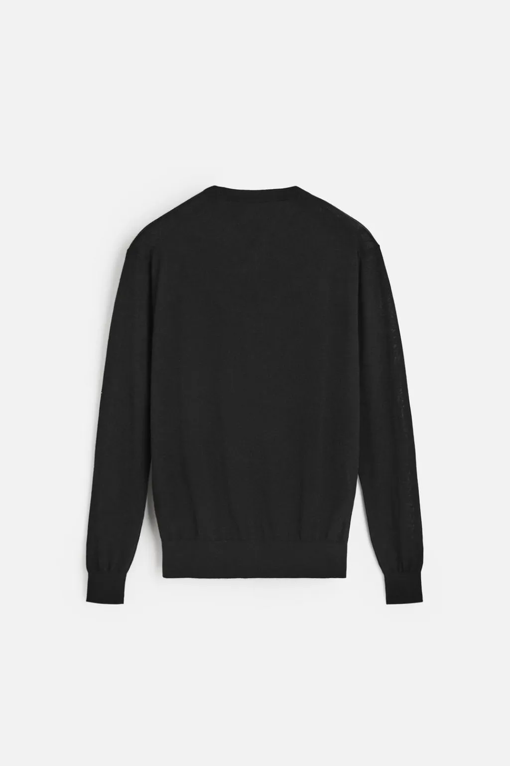 Jersey regular fit de punto ligero tejido en hilatura con mezcla de de lana merino y cashmere. Cuello pico y manga larga. Acabados en rib.