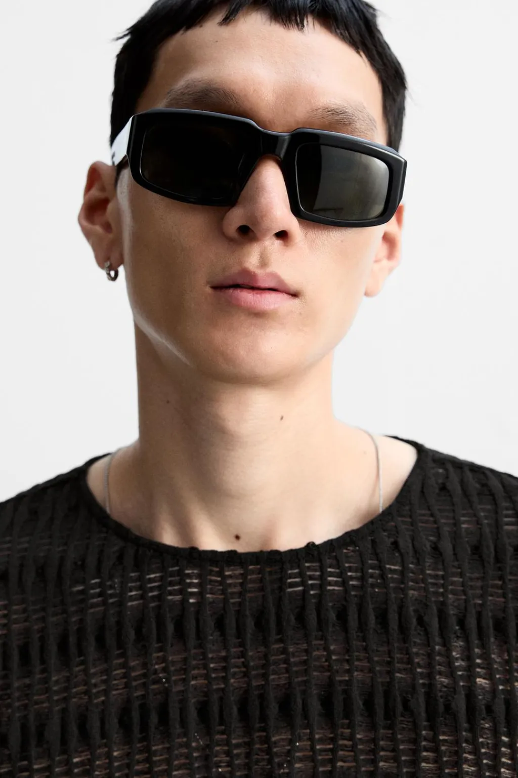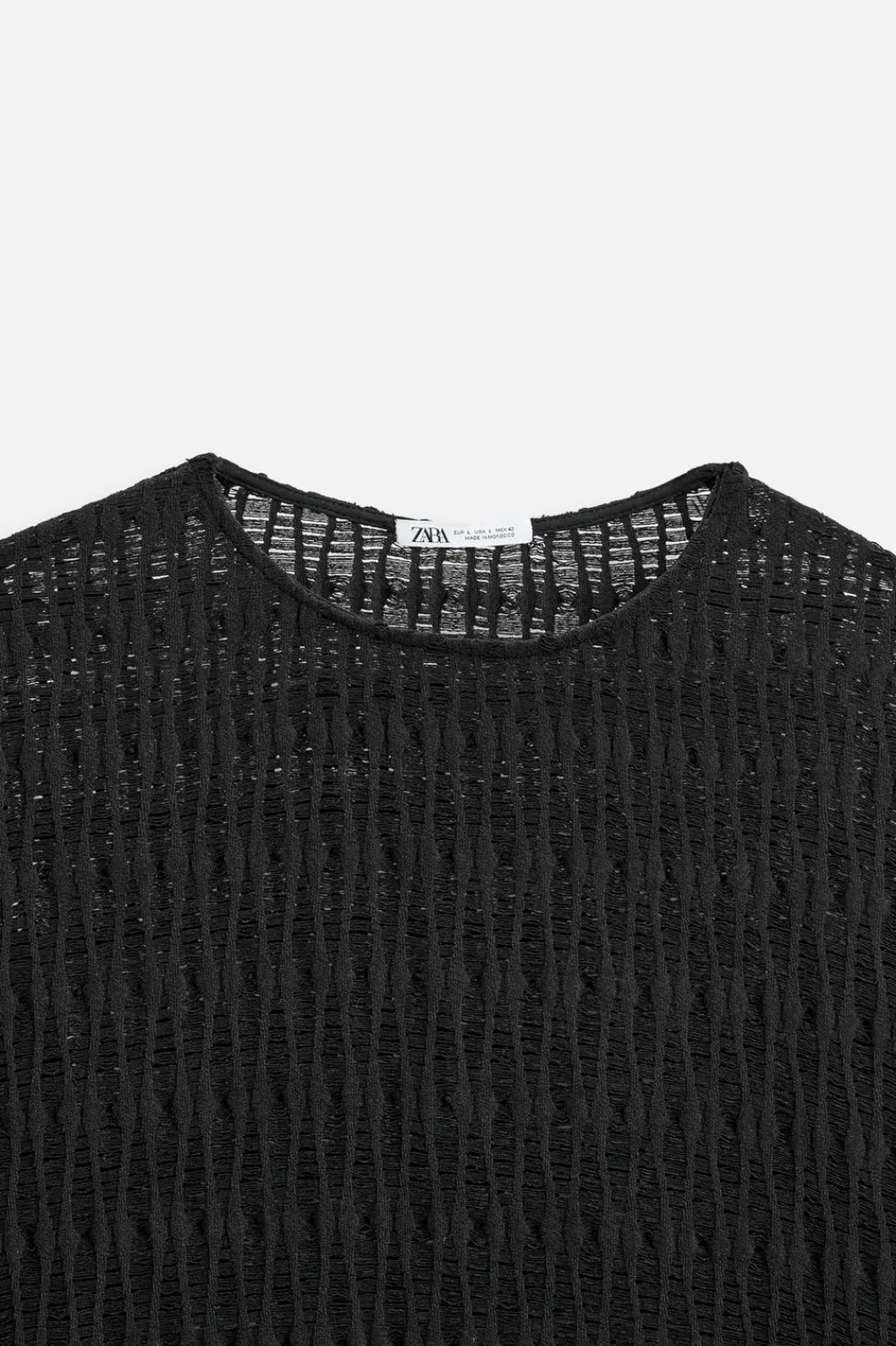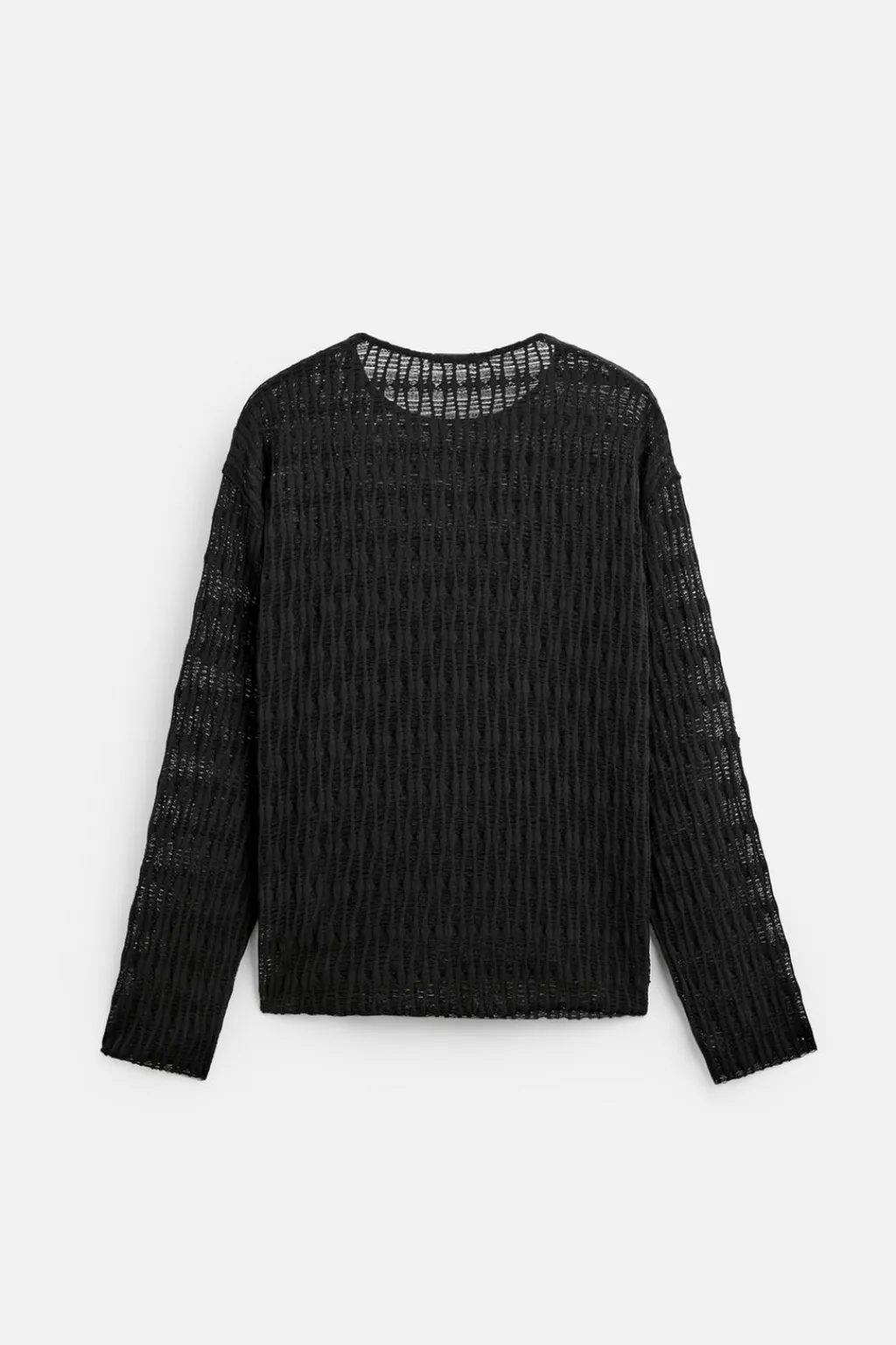 Jersey tejido en hilatura con algodón y estructura abierta. Cuello redondo y manga larga.