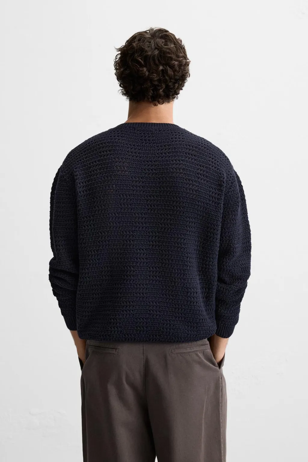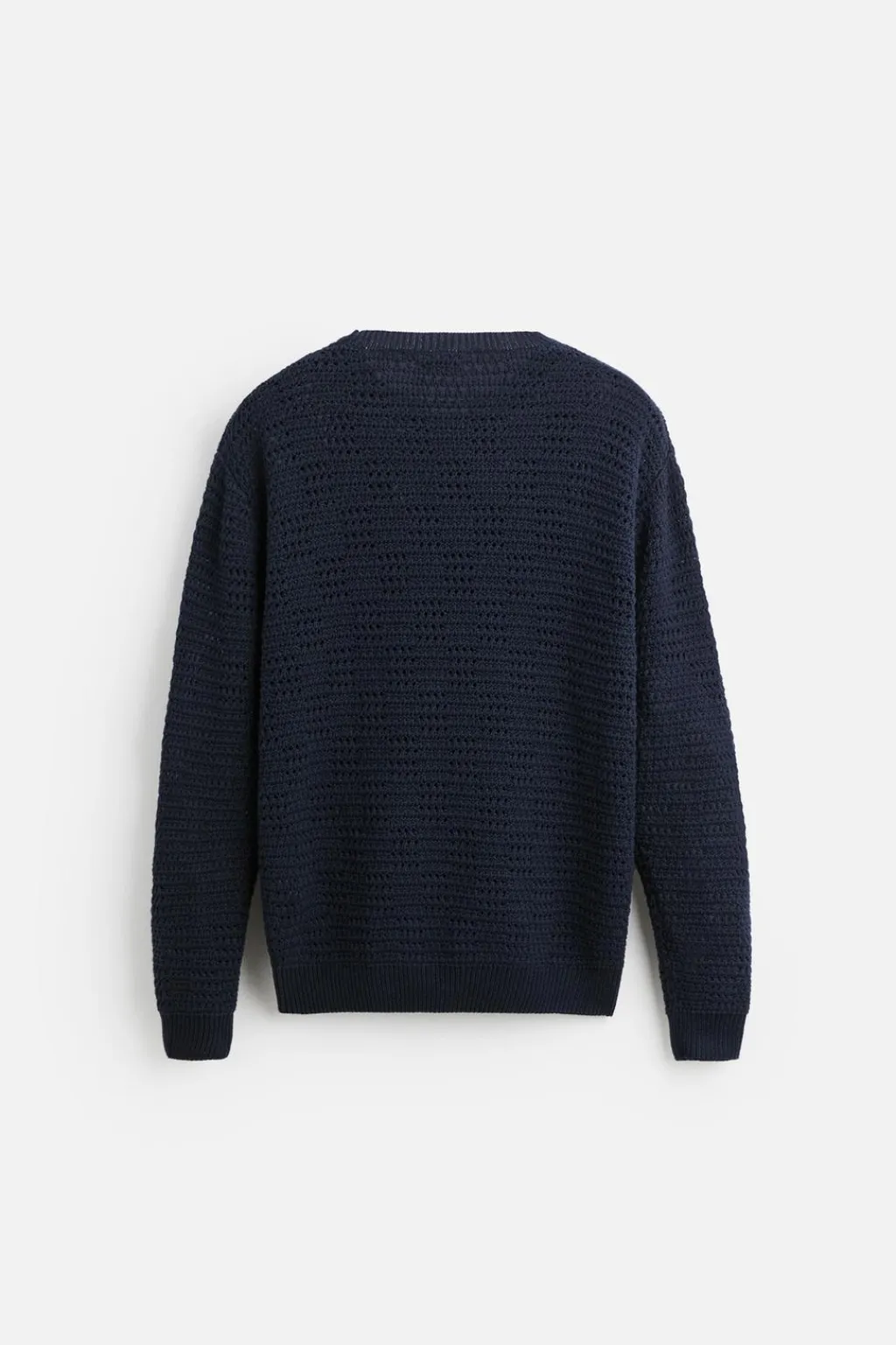 Jersey tejido en hilatura de algodón y estructura abierta. Cuello redondo y manga larga. Acabados con rib.