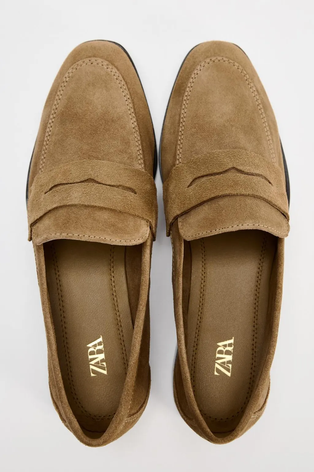 Zapato plano tipo mocasín en piel. Copete subido y antifaz. Acabado en punta redonda.