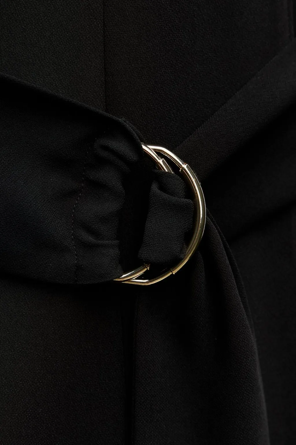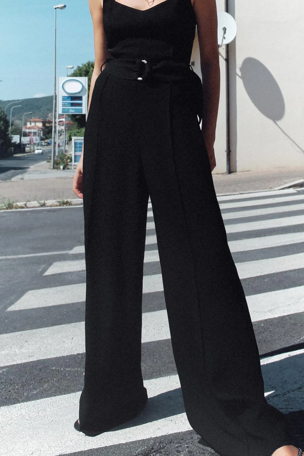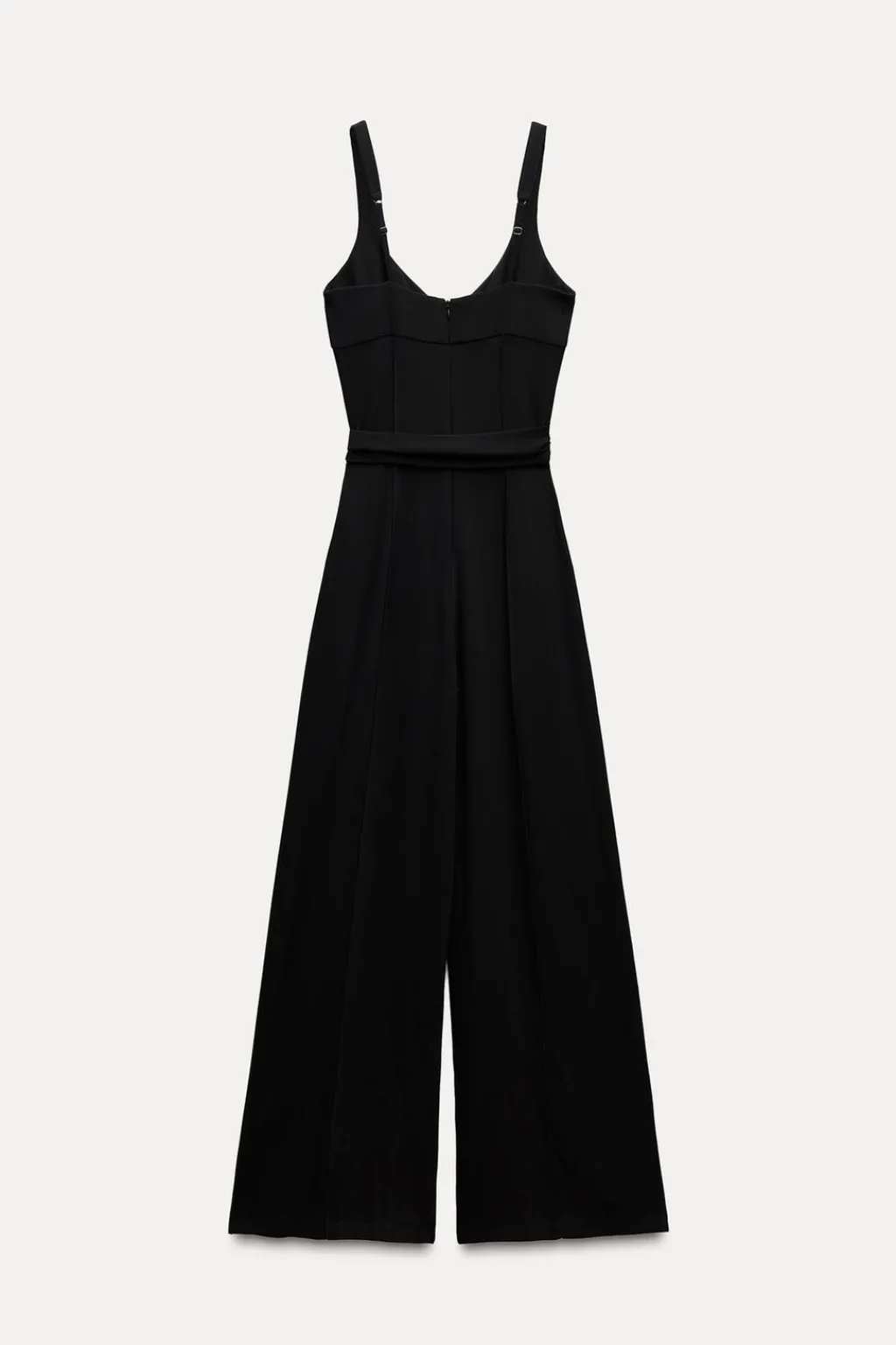 Mono de escote redondo y tirantes finos ajustables. Detalle de cinturón del mismo tejido con doble hebilla dorada. Pernera ancha. Cierre en espalda con cremallera oculta en costura.
