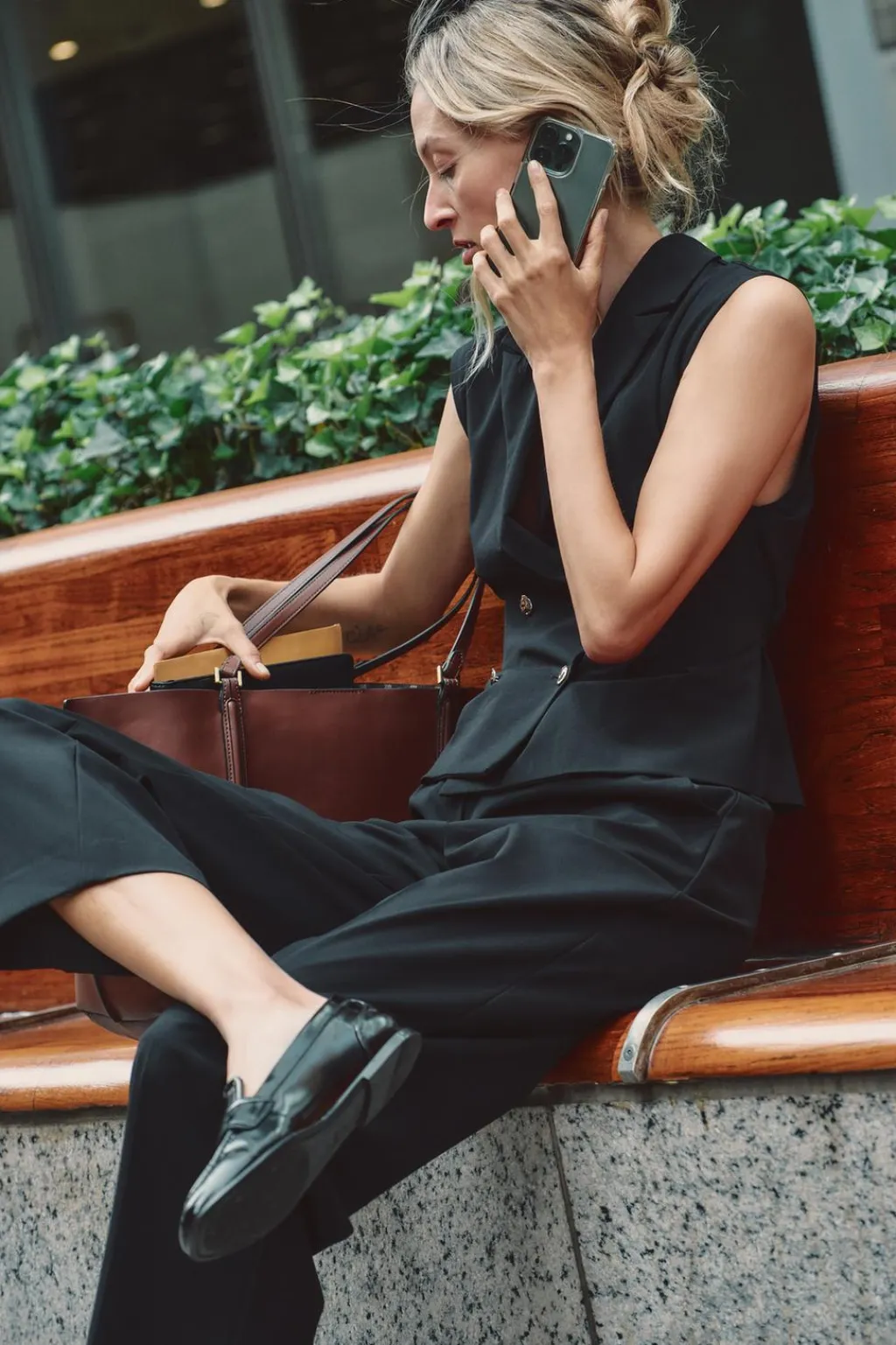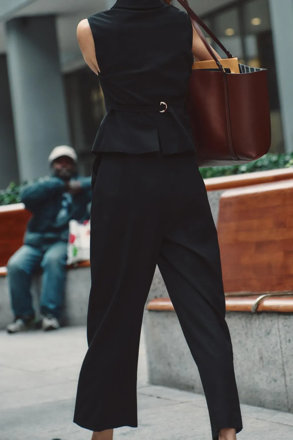 Mono con chaleco entallado de cuello solapa y manga sisa. Pernera ancha. Bolsillos delanteros. Cierre frontal con cremallera y gancho oculto.