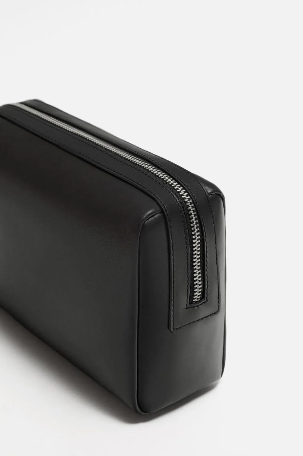 Bolsa de aseo confeccionada en piel. Construcción soft. El compartimento principal se cierra mediante cremallera. En su interior tiene un bolsillo pequeño con cierre de cremallera. Cuenta con asa de mano en uno de los laterales.