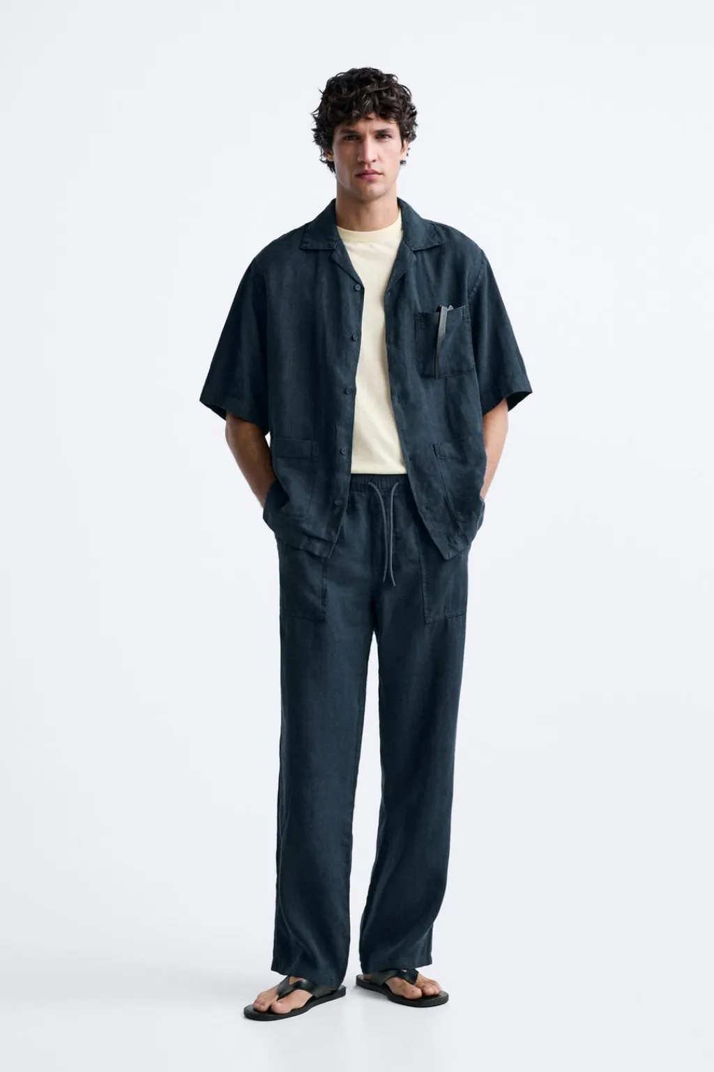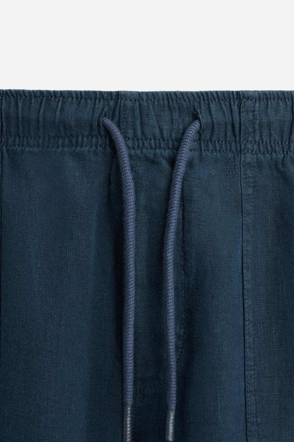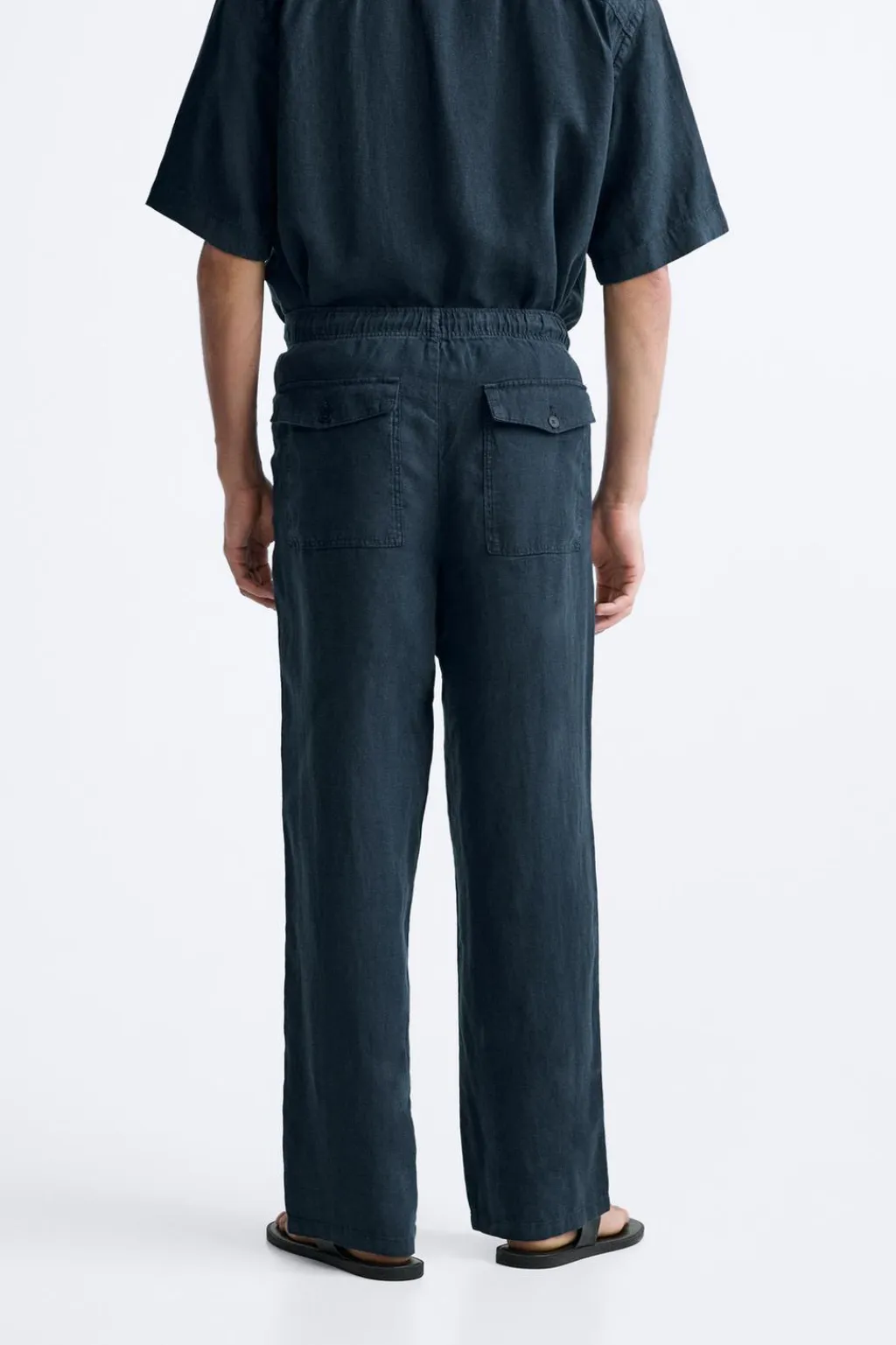 Pantalón regular fit confeccionado en tejido de lino. Cintura elástica ajustable con cordón. Bolsillos frontales y detalle de bolsillos traseros de plastrón con solapa. Efecto lavado.