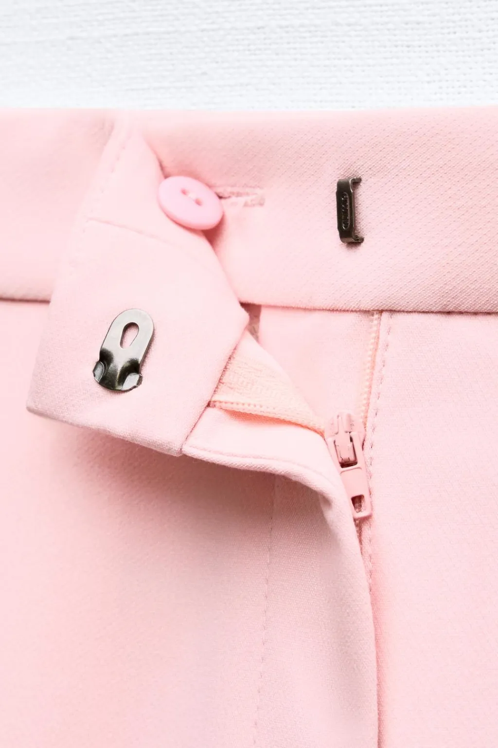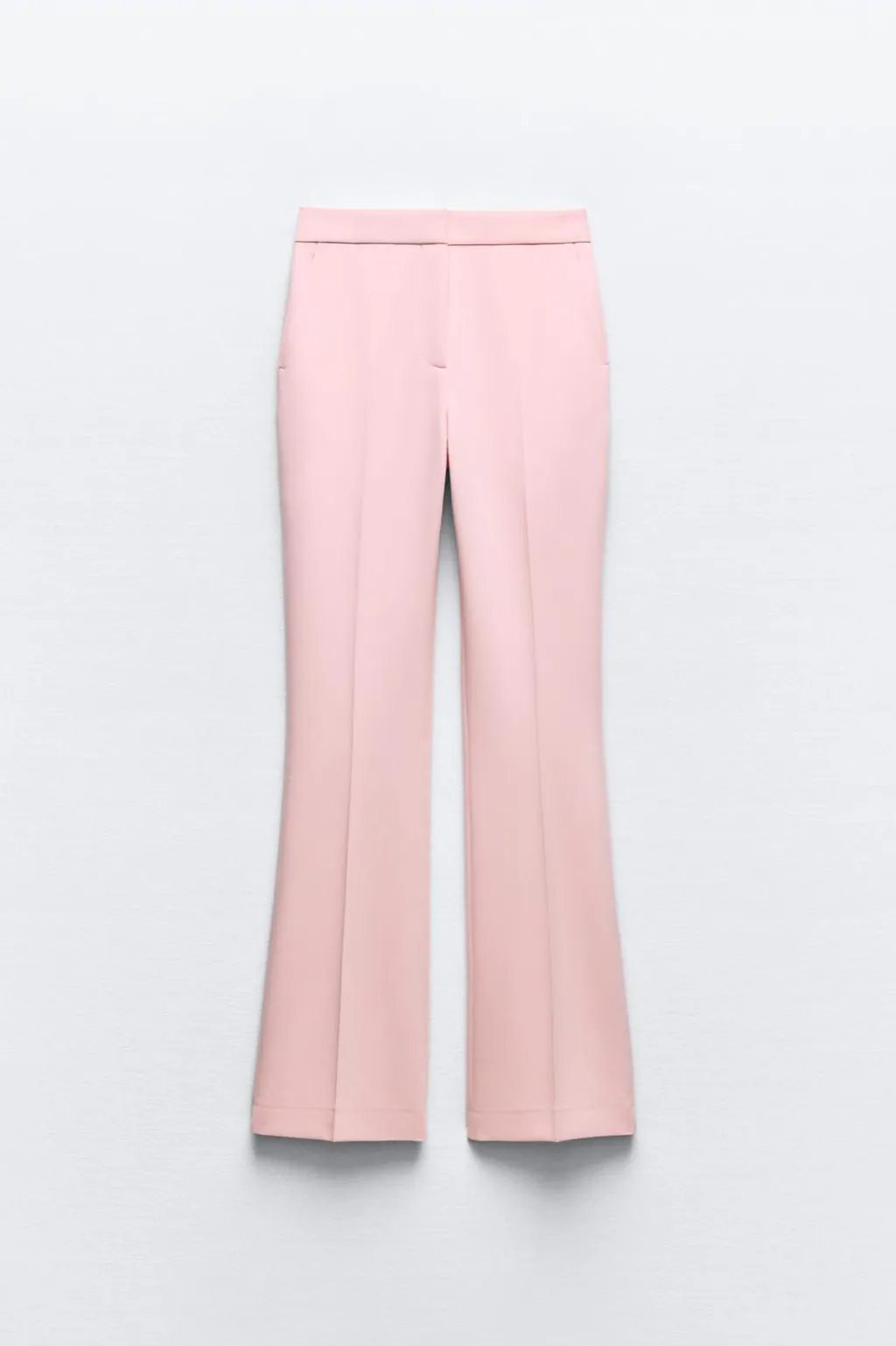 Pantalón de tiro alto con bolsillos delanteros y falsos bolsillos de vivo en espalda. Pernera larga acabada en evasé. Cierre frontal con cremallera, botón interior y gancho.
