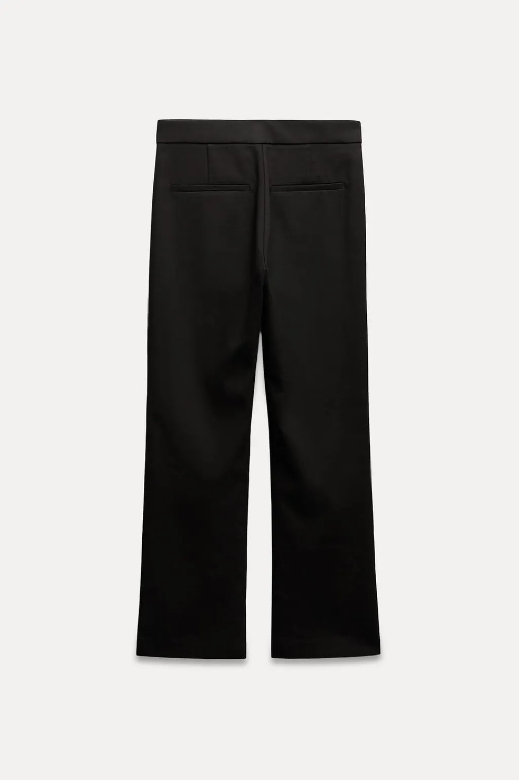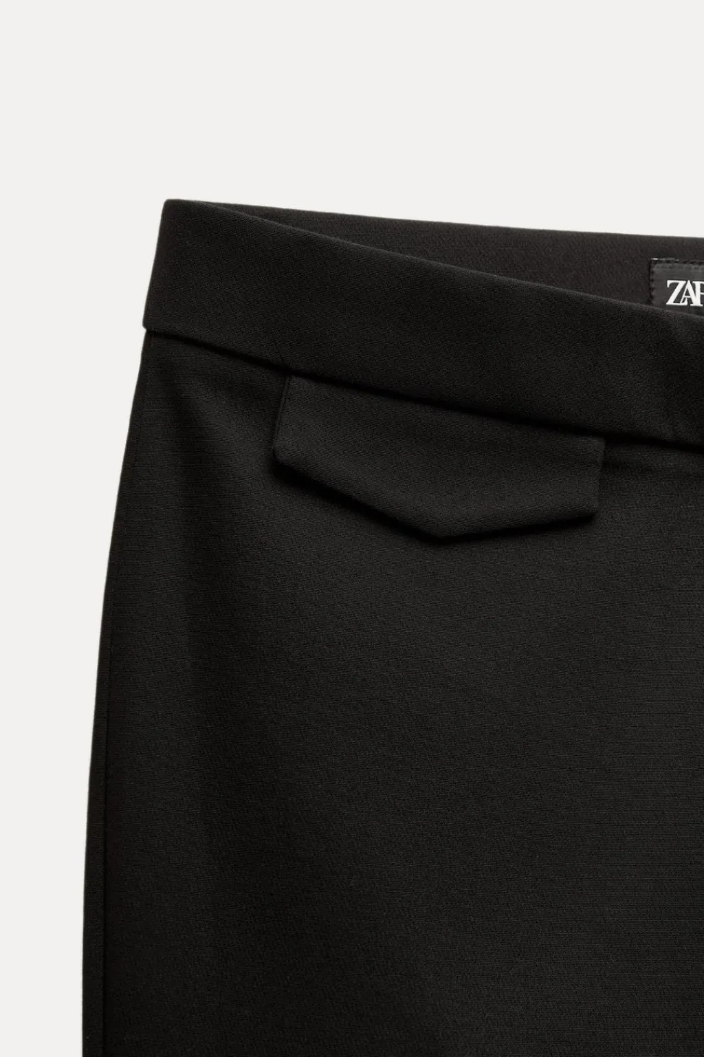 Pantalón de tiro alto. Falso bolsillos de vivo en espalda y detalle de solapa en delantero. Bajo acabado en línea evasé. Cierre frontal con cremallera y gancho metálico.