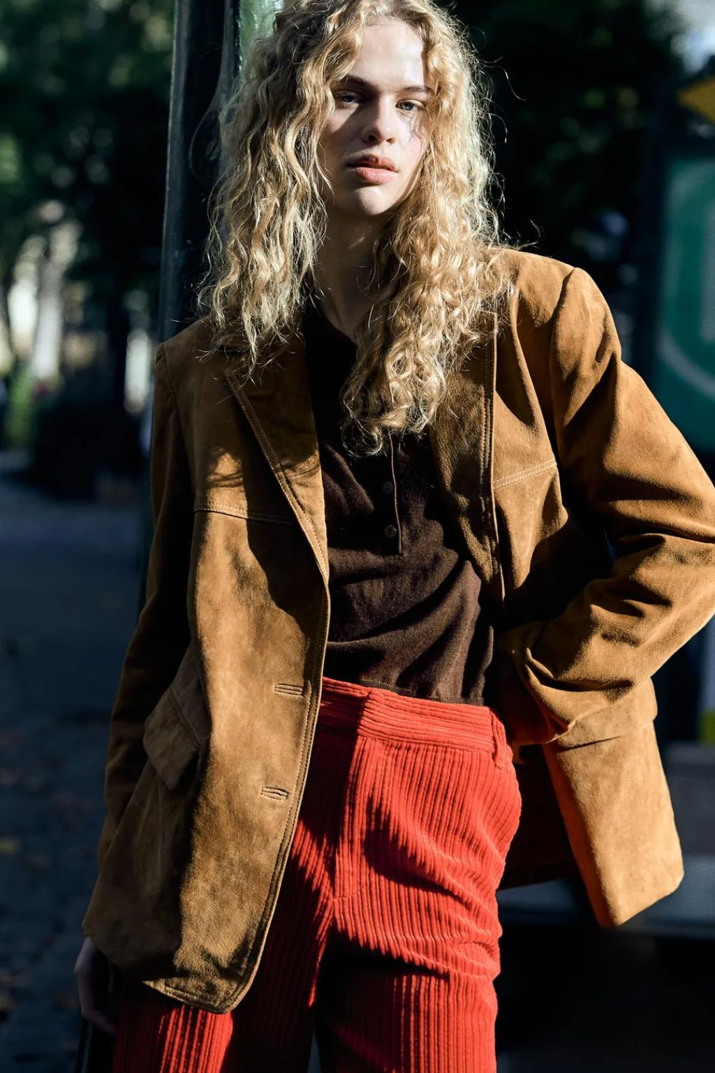Pantalón confeccionado en pana. Tiro medio con trabillas. Bolsillos laterales y falsos bolsillos de vivo en espalda. Cierre frontal con cremallera y gancho metálico.