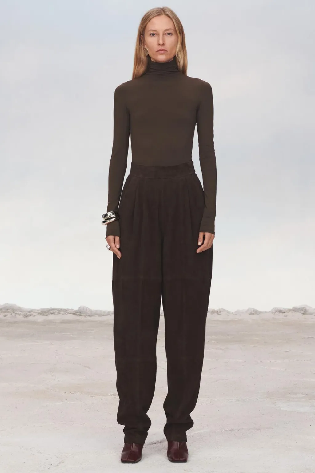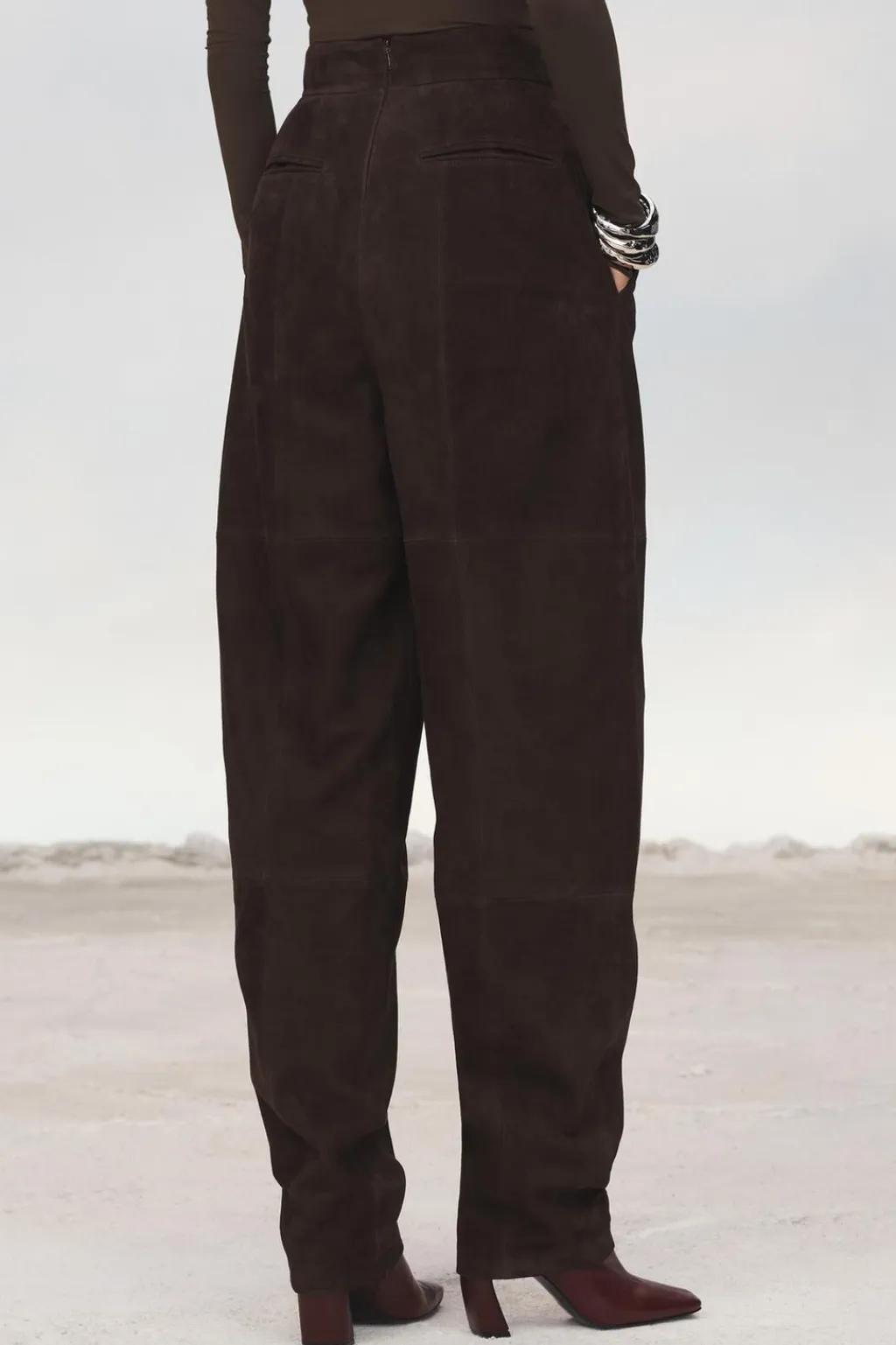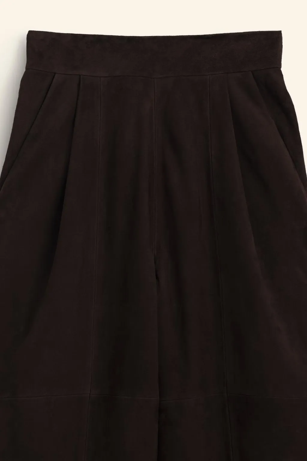 Pantalón de tiro alto realizado en piel de ante 100%. Bolsillos laterales y de vivo en espalda. Detalle de pinzas en delantero. Cierre en espalda con cremallera oculta en costura.