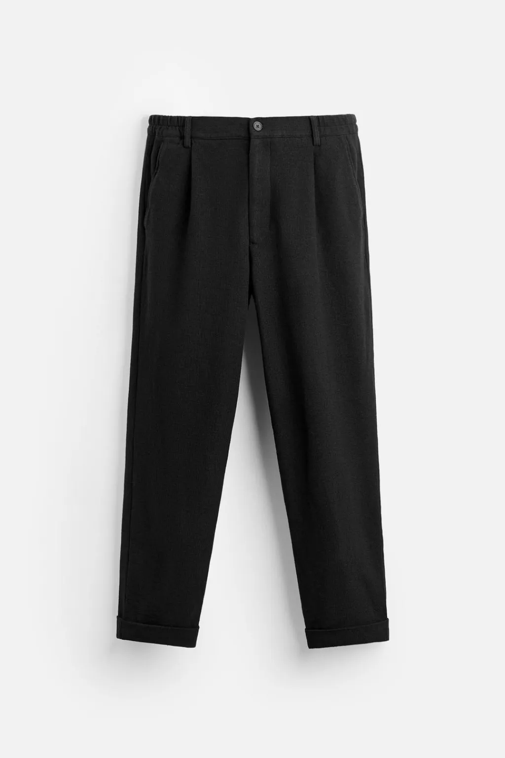 Pantalón relaxed fit confeccionado en tejido con mezcla de algodón. Cintura con detalles de pliegues frontales. Bolsillos delanteros y detalle de bolsillos traseros de vivo. Bajo acabado con vuelta. Cierre frontal con cremallera y botón.