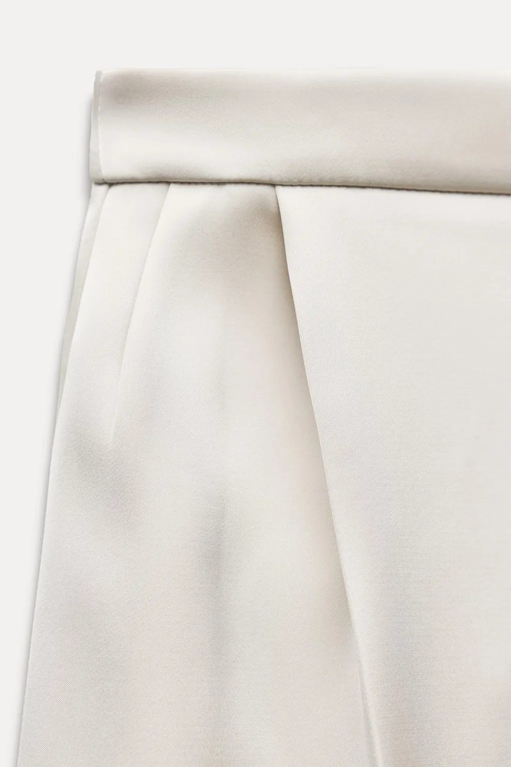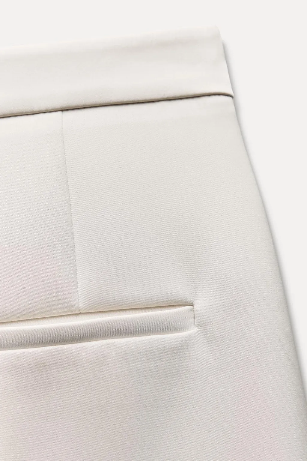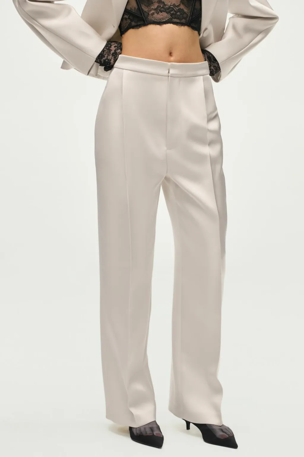 Pantalón satinado de tiro medio. Bolsillos laterales ocultos en costura y de vivo en espalda. Detalle de pinzas en delantero. Cierre frontal con cremallera, botón y gancho metálico.